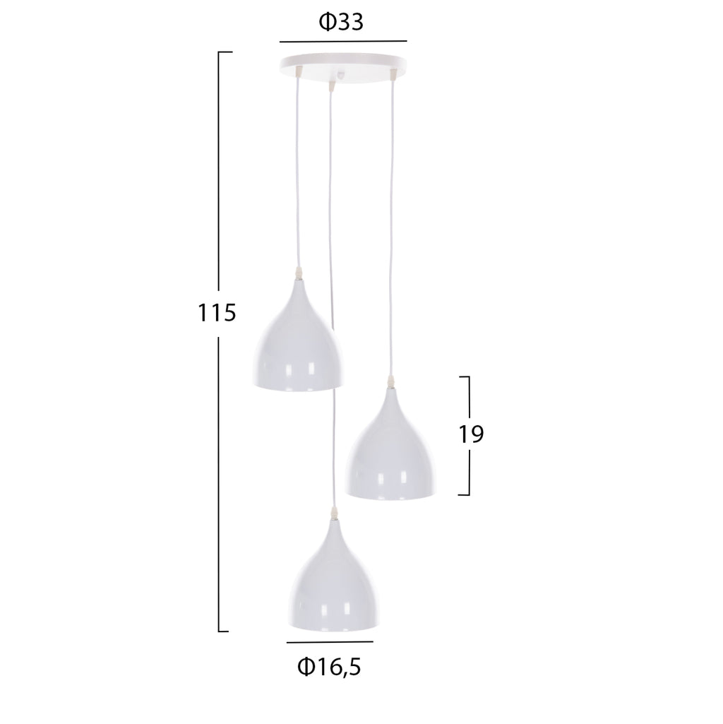 Открийте нашата нова 3-светлинна висяща таванна лампа и не се колебайте да я включите във вашия декор. Красивият БЯЛ метал на цялата лампа и 3-те светлини на различна височина ще придадат свеж вид и усещане на пространството. Идеален както за дома, така и за бизнес помещения. ТЕХНИЧЕСКИ ХАРАКТЕРИСТИКИ: Цокъл на крушка: E27 Цокъл с обикновена крушка Тип на крушката: Препоръчително е да се използва LED 20w Размери: Φ33x33-115H cm. Размери на шапката: 16.5x19H см. CE сертифицирана ПОДДРЪЖКА: Най-важното нещо за тази конкретна лампа е нейното редовно почистване от прах. Ако имате време, разбира се, използвайте влажна кърпа и я направете да изглежда като нова. *Крушките не са включени в цената ** Цветопредаването на продукта може леко да се различава от фотографското изображение на вашия екран.