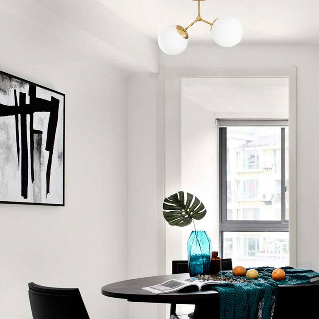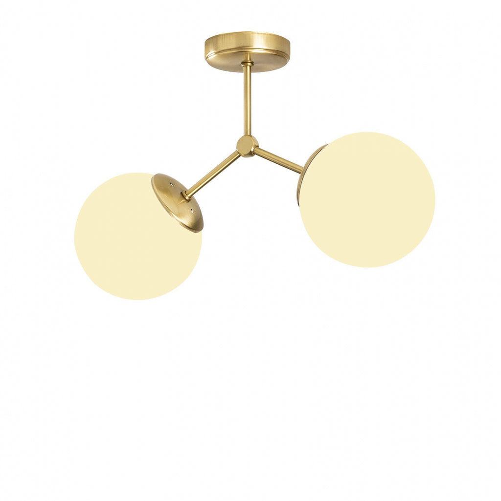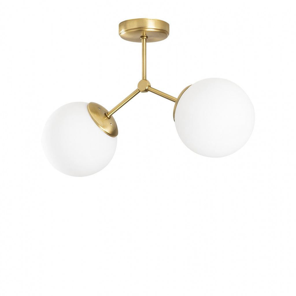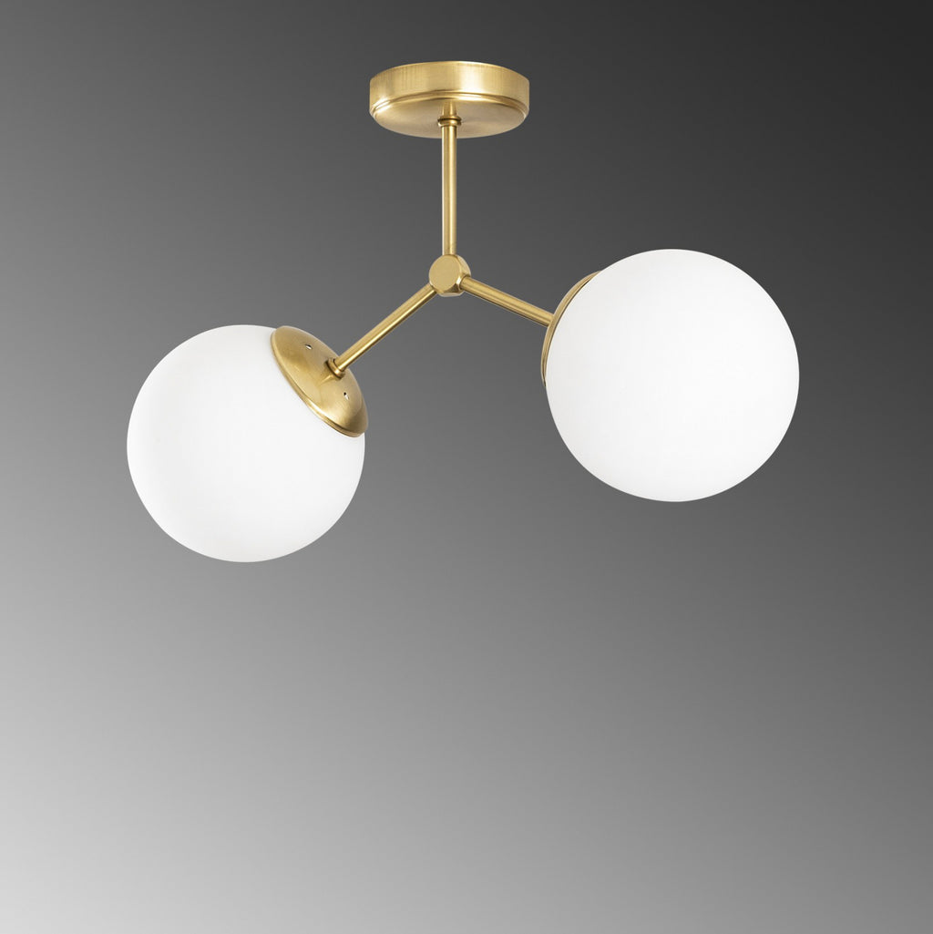 Модерна плафониера, която впечатлява и се откъсва от обичайните класически стандарти, с елегантен и деликатен външен вид. Изработена от метална рамка в златен цвят и стъкло в бял цвят. Неговият оригинален асиметричен дизайн го прави идеален за всяка част от дома. Приема 2 крушки E27. Крушките не са включени. Размери: 44х15х28см. Цвят на основата: Златен Цвят на окачването: Златен Цвят на стъклото: Бяло Тип лампа: Двусветлинна лампа Стил: Модерен дизайн на лампа: Метална електростатична боя Европейско производство и произход. Продуктът се предлага във фабрична опаковка.