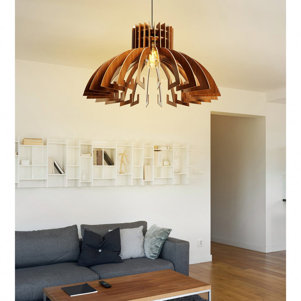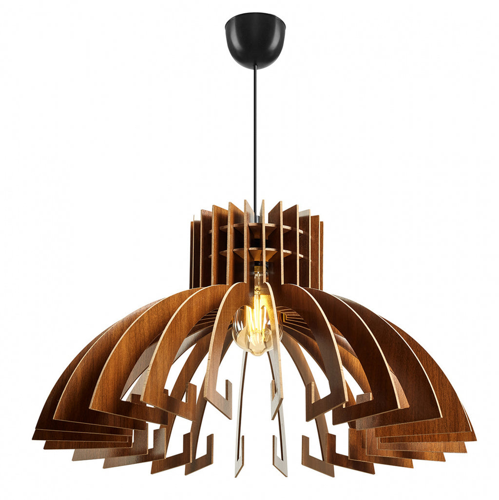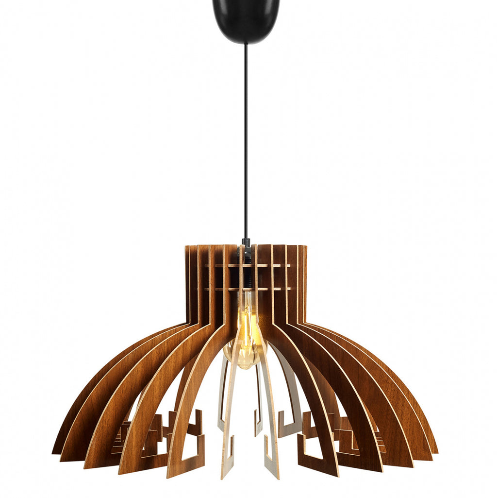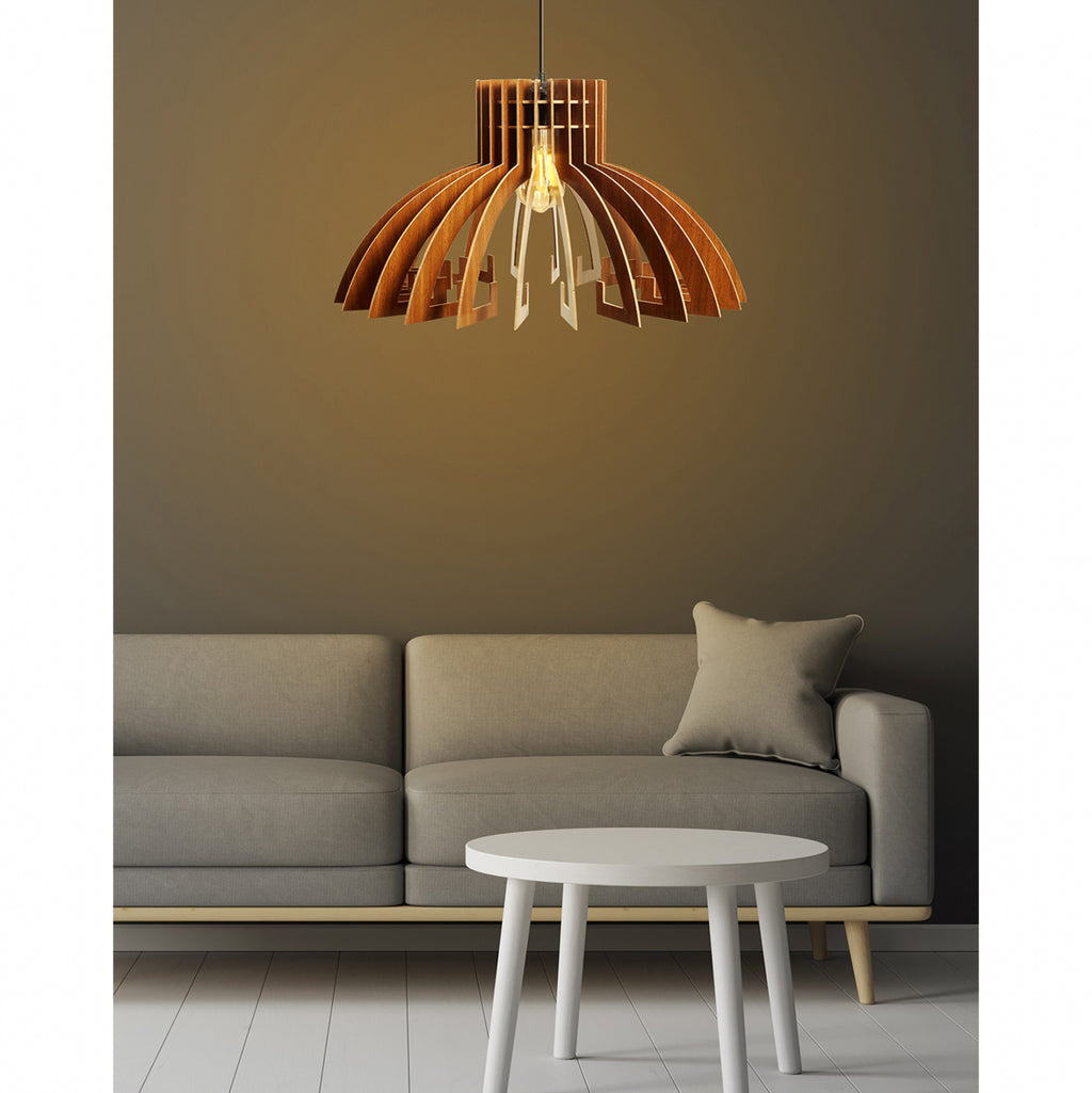 Ако искате да украсите вашето пространство с лампа, която да покрие всички ваши нужди, това е правилният избор. Изработен е изцяло от мдф в нюанс орех. Височината на лампата се регулира в зависимост от начина на поставяне, така че да можете да я конфигурирате на височината, която ви удовлетворява. Осветително бижу, което ще внесе елегантен дизайн и осветление във вашето пространство и ще промени настроението ви към по-добро. Дизайнът и формата му създават ефект, който ще харесате. Перфектен за вашия дом или бизнес. Приема крушка Е27 до 60W, която не е включена в комплекта. Абажур: Орех Размери: Φ54x65H см. Размери на шапката: Φ54x30Y см. Подходяща за лампа E27 max 45-60W европейско производство и произход. Продуктът се предлага във фабрична опаковка.