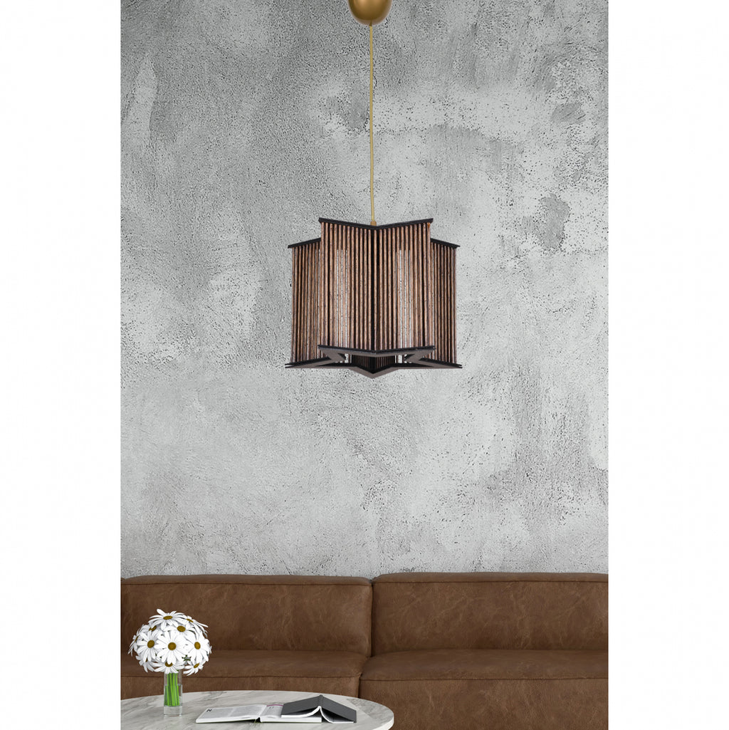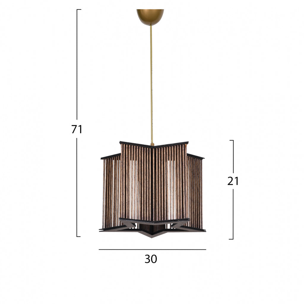 Плафон, в комбинация от цветове черно, златно и естествен бамбук. Лампа с отлично качество, с отличителен дизайн, благодарение на формата на звезда, оригинален и елегантен стил, за обновяване на декорацията на вашето лично пространство. Изработена от метална рамка, изключително издръжлива и бамбукова шапка. Приема крушка E27, Max 60Watt, която не е включена в пакета. Размери: 30х71см. Европейско производство и произход. Продуктът се предлага във фабрична опаковка.