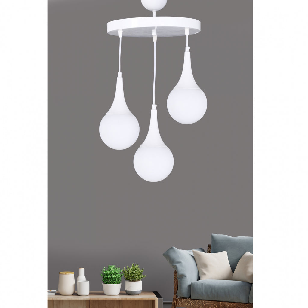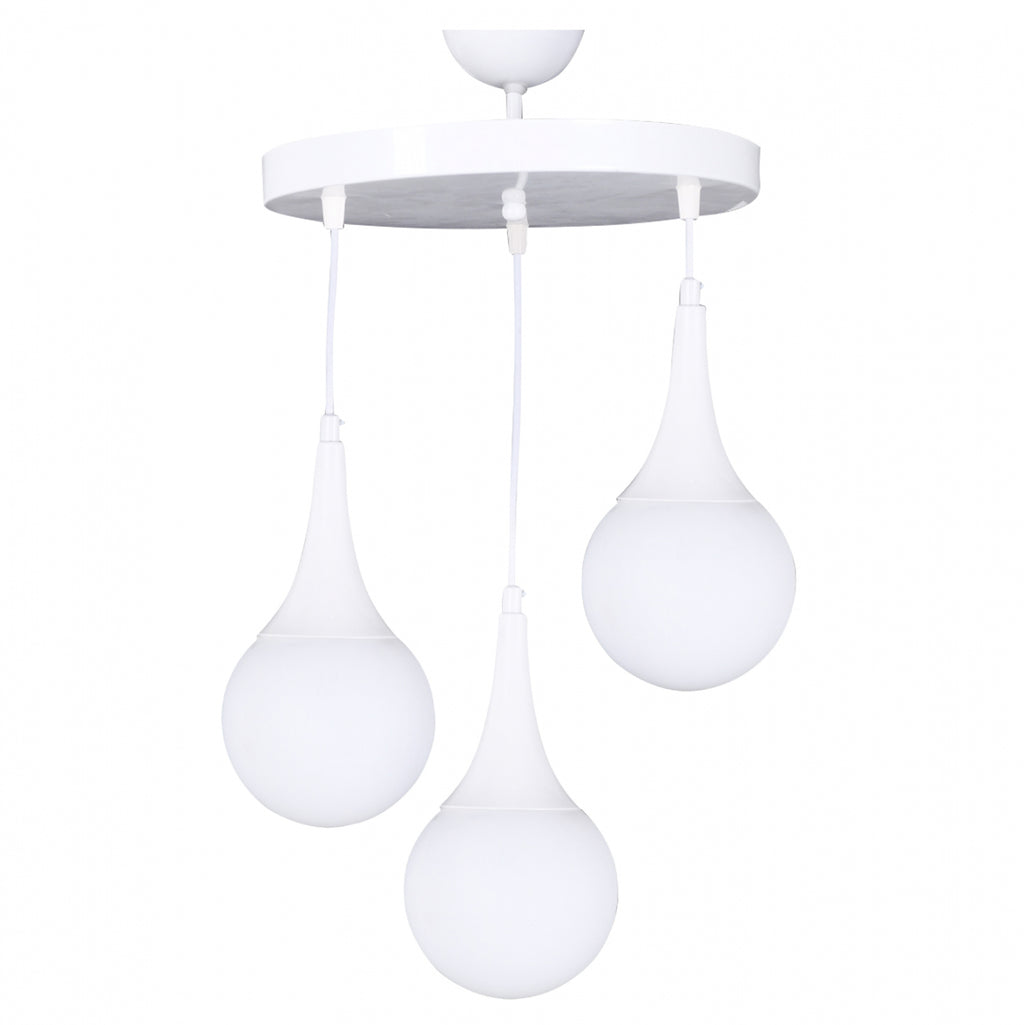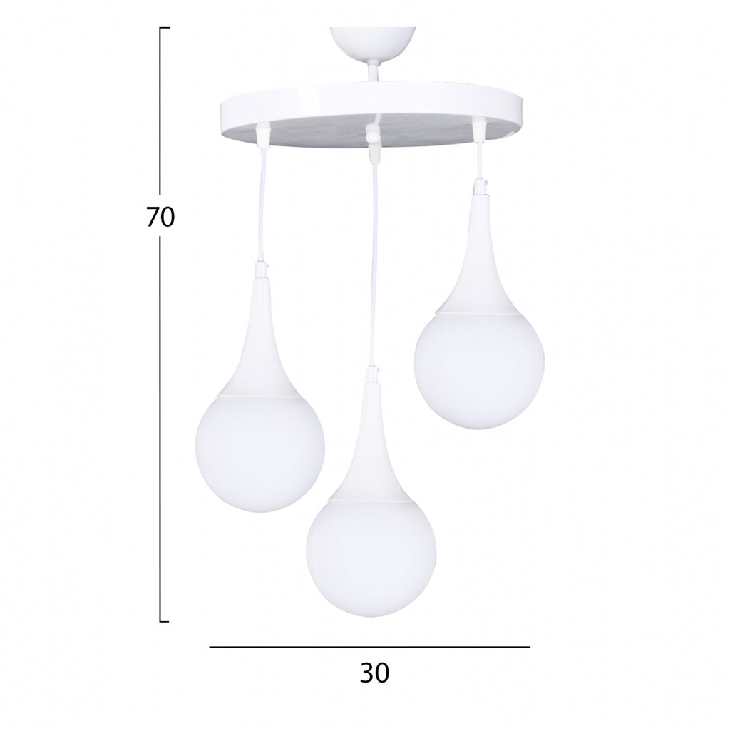 Плафон, 3 лампи, в бял абажур, бели глобуси. Лампа с изключително качество, с подчертан дизайн, оригинален и елегантен стил, за обновяване на декорацията на вашето лично пространство. Изработена от метална рамка, изключително издръжлива. Приема крушки E27, максимум 60 вата, които не са включени. Размери: 30х75см. Европейско производство и произход. Продуктът се предлага във фабрична опаковка.