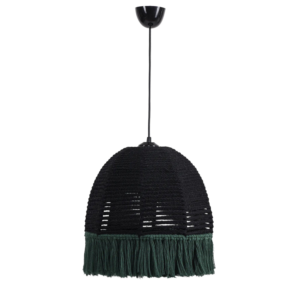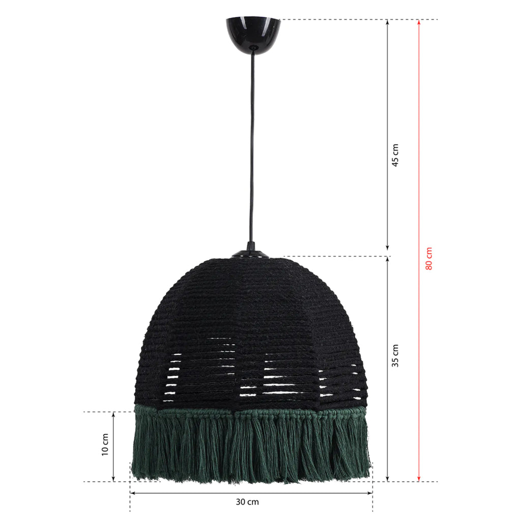 КГ7654.01- Висяща лампа---- Ако искате да украсите вашето пространство с лампа в бохо стил, това е правилният избор. Представлява едносветеща лампа с "шапка" във формата на камбана, изработена от ЧЕРНО тънко плетено въже, висококачествена и издръжлива. Особеното при тази лампа обаче е, че "шапката" завършва с ресни в цвят кипарис, придавайки различно усещане на пространството. ТЕХНИЧЕСКИ ХАРАКТЕРИСТИКИ: Цокъл за лампа: Е27 Нормален Цокъл Размери: Φ30x80Yсм. CE сертифициран МАТЕРИАЛ НА ИЗРАБОТКА: "Шапката" е изработена от фино оригинално тъкано въже от естествен памук, с високо качество и издръжливост. Знаете ли, че....? Въжето е линейна структура, състояща се от влакна, увити едно около друго, използвани за връзване или връзване на предмети или животни. Влакната могат да бъдат растителни (конопени, конопени), кожени, синтетични или метални нишки. Продава се увит на топки или навит в цилиндрична форма. ПОДДРЪЖКА: Лампата не се нуждае от специална поддръжка. Достатъчно е почистване на прах на редовни интервали. Също така, благодарение на устойчивостта на въжето към вода, можете периодично да използвате мокра кърпа, за да почиствате лампата. ПРЕДИМСТВА: Естетическото превъзходство на тази лампа ще я накара да се открои във вашето пространство. Освен в различни стаи във вашия дом, той може да се впише и в професионални помещения като ресторанти, кафенета, хотели и др. ЧЕРНИЯТ цвят, съчетан с ресни КИПАРИС, хваща окото и може моментално да промени настроението ви. Светлината се разсейва красиво в пространството както през мрежата на "камбаната", така и предимно надолу. В същото време може да се комбинира с много други материали и дизайни, за да подчертае напълно естетическите достойнства на лампата, тъй като въжето е идеално за композиране на елегантни жилищни пространства, с безкрайни комбинации с необичайни щрихи.