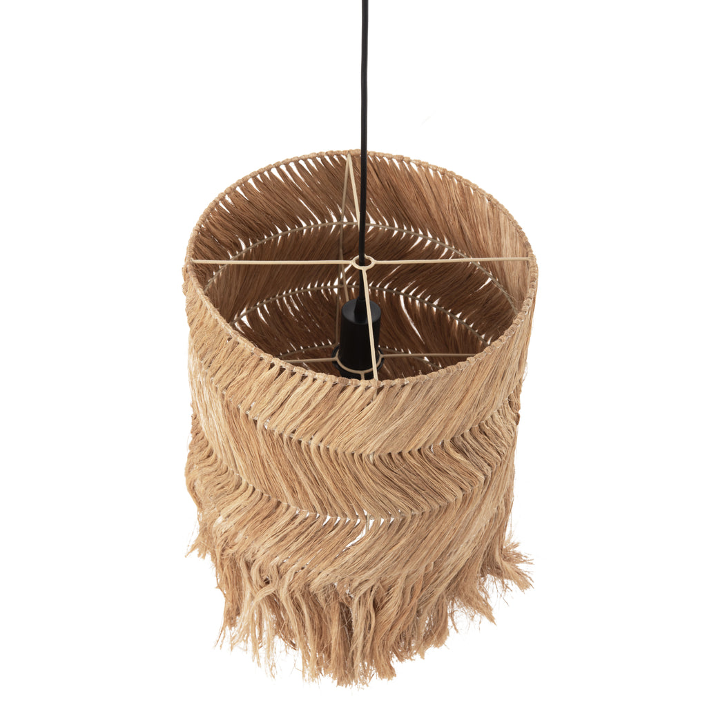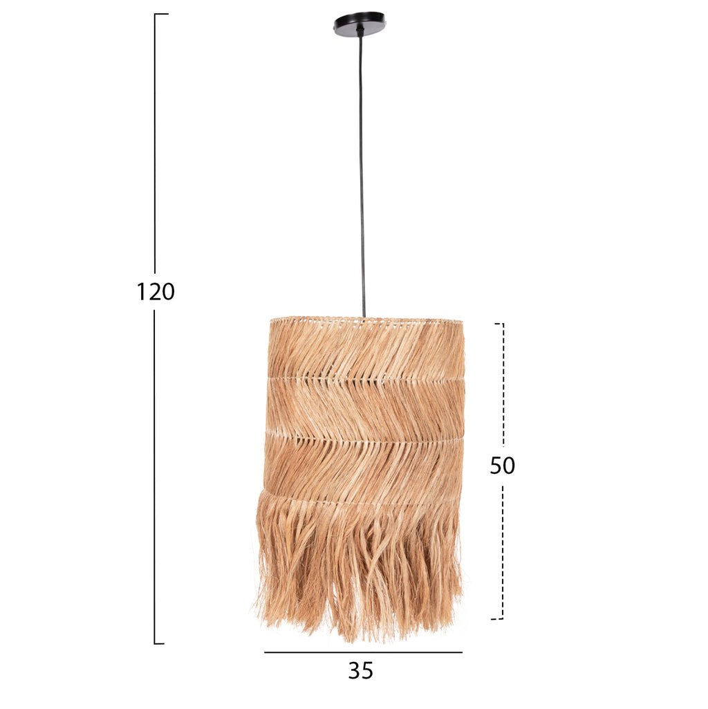 КГ7756- Висяща лампа---- Ако искате да украсите вашето пространство с лампа в бохо стил, това е правилният избор. Представлява едносветлинна лампа с дълга цилиндрична "шапка" от манилски конопени влакна или иначе абака, в естествен цвят (русо) в 3 реда с противоположна посока на влакната и ресни по края. ТЕХНИЧЕСКИ ХАРАКТЕРИСТИКИ: Цокъл за лампа: E27 Нормален Цокъл Размери: 35x35x50Y см. CE сертифициран КОНСТРУКТИВЕН МАТЕРИАЛ: „Шапката“ е направена от въже от влакна от абака или коноп от Манила. Манилският коноп е вид ярко оцветено влакно, получено от Musa textilis (роднина на ядливите банани), наричано още манилски коноп, както и абака. Абаката е изключително здраво влакно, много скъпо и в пъти по-скъпо от дървесната маса. Името се отнася до столицата на Филипините, един от основните производители на канабис, Манила. Отглеждането на растения абака може да намали ерозията, да увеличи биоразнообразието и да обогати почвата. И накрая, той е устойчив на вода и влага. ПОДДРЪЖКА: Лампата не се нуждае от специална поддръжка. Достатъчно е почистване на прах на редовни интервали. Освен това, благодарение на водоустойчивостта й, можете периодично да използвате мокра кърпа, за да почиствате лампата. ПРЕДИМСТВА: Естетическото превъзходство на тази лампа ще я накара да се открои във вашето пространство. Идеален както за дома, така и за бизнес зони като ресторанти, кафенета, хотели и др. Цветът, съчетан с ресни, приковава окото и може моментално да промени настроението ви. Светлината се разпръсква красиво в пространството предимно надолу. В същото време може да се комбинира с много други материали и дизайни, за да подчертае напълно естетическите достойнства на лампата, тъй като въжето като цяло е идеално за състава на елегантни жилищни пространства, с безкрайни комбинации с необичайни щрихи.