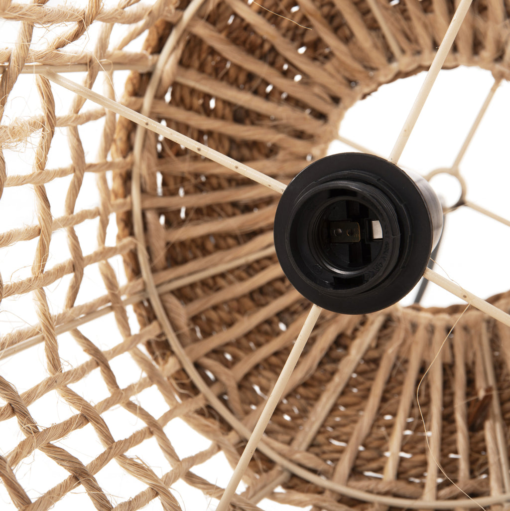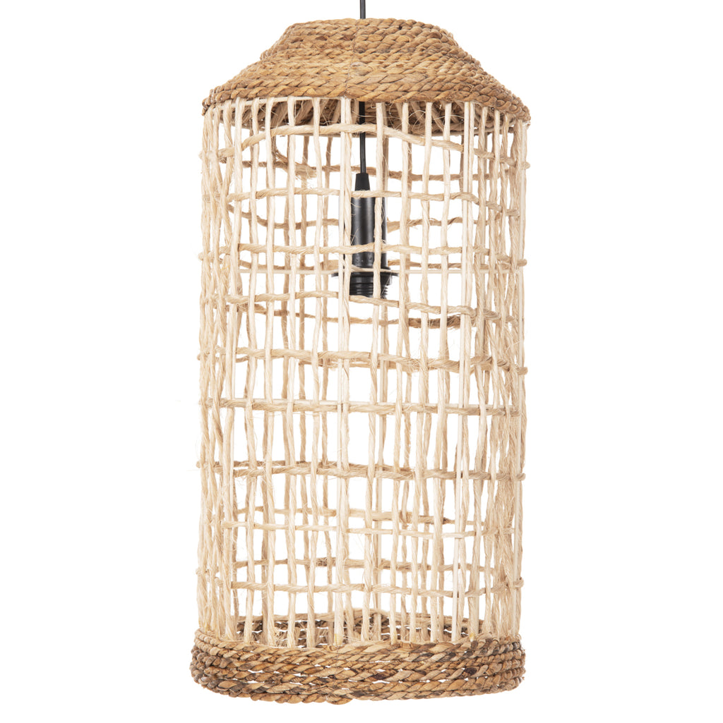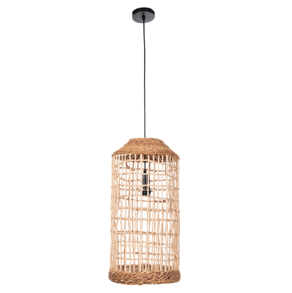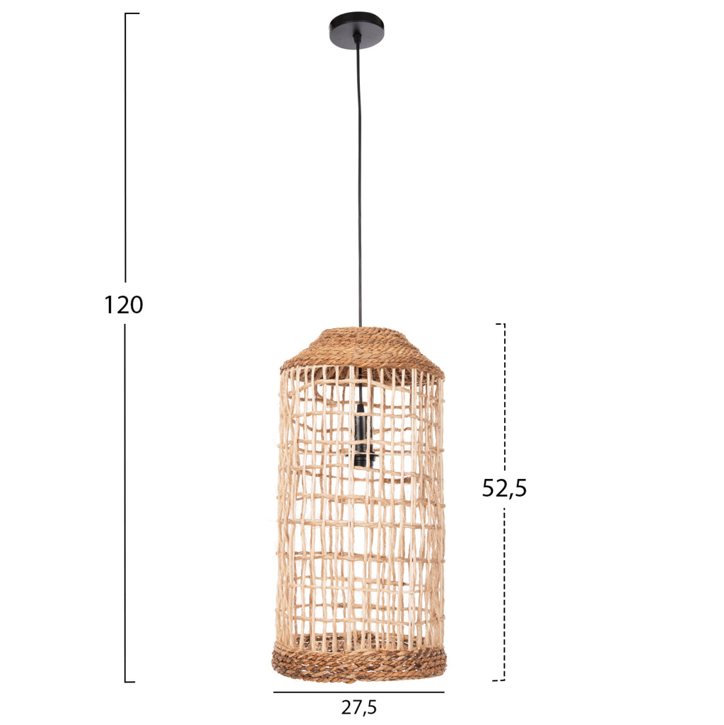 КГ7767- Висяща лампа---- Ако искате да украсите вашето пространство с лампа в много специален стил, това е правилният избор. Представлява едносветлинна лампа с дълга цилиндрична "шапка" в стил клетка, изработена от манилски конопени влакна или иначе абака, в естествен цвят. ТЕХНИЧЕСКИ ХАРАКТЕРИСТИКИ: Тип фасунга на лампата: E27 Нормална фасунга Размери на капачката: Φ27.5x52.5Y cm. Обща височина: 120см. CE сертифициран КОНСТРУКТИВЕН МАТЕРИАЛ: „Шапката“ е направена от въже от влакна от абака или коноп от Манила. Манилският коноп е вид ярко оцветено влакно, получено от Musa textilis (роднина на ядливите банани), наричано още манилски коноп, както и абака. Абаката е изключително здраво влакно, много скъпо и в пъти по-скъпо от дървесната маса. Името се отнася до столицата на Филипините, един от основните производители на канабис, Манила. Отглеждането на растения абака може да намали ерозията, да увеличи биоразнообразието и да обогати почвата. И накрая, той е устойчив на вода и влага. ПОДДРЪЖКА: Лампата не се нуждае от специална поддръжка. Достатъчно е почистване на прах на редовни интервали. Можете също така периодично да използвате мокра кърпа, за да почиствате лампата. ПРЕДИМСТВА: Естетическото превъзходство на тази лампа ще я накара да се открои във вашето пространство. Идеален за дома, но и за бизнес зони като ресторанти, кафенета, хотели и др. Дизайнът хваща окото и може моментално да промени настроението ви. Светлината се разпръсква красиво в пространството във всяка посока. В същото време може да се комбинира с много други материали и дизайни, за да подчертае напълно естетическите достойнства на лампата, тъй като въжето като цяло е идеално за състава на елегантни жилищни пространства, с безкрайни комбинации с необичайни щрихи.