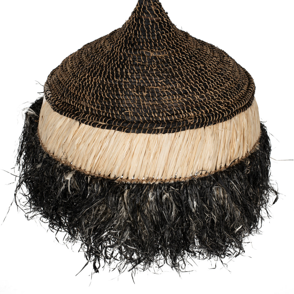 КГ7788- Пендел---- Ако искате да украсите вашето пространство с лампа в бохо стил с екзотични материали, това е типичен избор. Това е единична лампа с "шапка" във формата на камбана, изработена от влакна от сизал в естествен цвят и рециклирани влакна от манила коноп в черно.