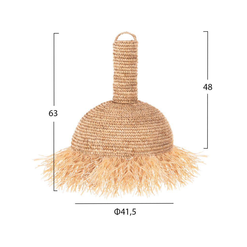 КГ7855- Висяща лампа---- Ако искате да украсите вашето пространство с лампа в бохо стил с екзотични материали, това е типичен избор. Представлява монолайт с камбанова "шапка" от влакно от палмови листа с ресни, в НАТУРАЛЕН цвят. Има и дръжка за окачване. ТЕХНИЧЕСКИ ХАРАКТЕРИСТИКИ: Цокъл за лампа: E27 Нормален Цокъл Размери: Φ41.5x43.5-48Y cm. Дължина на ресни: +15см. CE сертифициран МАТЕРИАЛ НА КОНСТРУКЦИЯТА: „Шапката“ е направена от изсушени палмови влакна, известни още като Table Palm или Fan Palm. Това е много привлекателна и елегантна палма с големи, лъскави ветрилообразни листа и бодливи стъбла. Расте в Югоизточна Азия и Нова Гвинея. ПОДДРЪЖКА: Лампата не се нуждае от специална поддръжка. Достатъчно е почистване на прах на редовни интервали. ПРЕДИМСТВА: Естетическото превъзходство на тази лампа ще я накара да се открои във вашето пространство. Идеален както за дома, така и за бизнес помещения като ресторанти, кафенета, хотели и др. Цветът, съчетан с материала на конструкцията, грабва окото и може веднага да промени настроението ви, тъй като светлината се разпръсква нежно в пространството. ** Цветопредаването на продукта може леко да се различава от неговото фотографско представяне на вашия екран.
