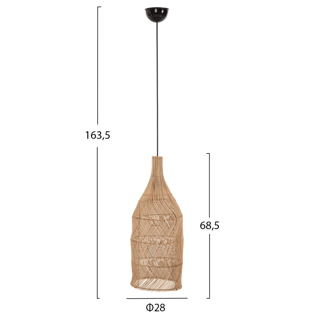 КГ7887- Висяща лампа---- Ако искате да украсите вашето пространство с лампа в много специален стил, не търсете повече! MH7887 е едносветова лампа с дълга цилиндрична "шапка" във формата на бутилка, изработена от естествен ратан в ЕСТЕСТВЕНИЯ си цвят с влакна подредени на зиг-заг. ТЕХНИЧЕСКИ ХАРАКТЕРИСТИКИ: Цокъл за лампа: Е27 Нормален Цокъл Размери: Φ28x68.5H cm. Обща височина: 163,5 см. CE сертифициран МАТЕРИАЛ НА КОНСТРУКЦИЯТА: "Шапката" е изработена от РАТАН с отлично качество. Ратанът е най-добрият и използван естествен материал за различни конструкции. Ратанът, отглеждан в Северна Азия, е най-висококачественият и най-издръжлив материал от подобни, отглеждани в други региони. С повече от 600 различни вида РАТАНА може да се разграничи като силно влакнесто растение, подобно на бамбука и широко използвано, защото е леко, издръжливо, гъвкаво и привлекателно. ПОДДРЪЖКА: Лампата не се нуждае от специална поддръжка. Достатъчно е почистване на прах на редовни интервали. ПРЕДИМСТВА: Тази висяща лампа е толкова стилна, колкото и красива. Идеален за дома, но и за бизнес зони като ресторанти, кафенета, хотели и др. Дизайнът хваща окото и може моментално да промени настроението ви. Светлината се разпръсква красиво в пространството във всяка посока. Атрактивната му цена и фактът, че е готов за доставка, го правят най-добрият избор за осветяване на вашето пространство!