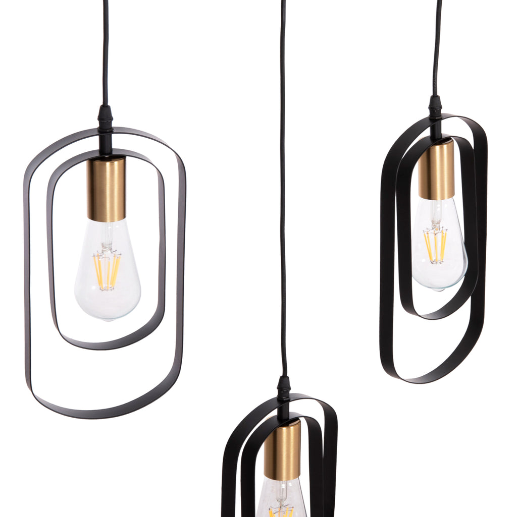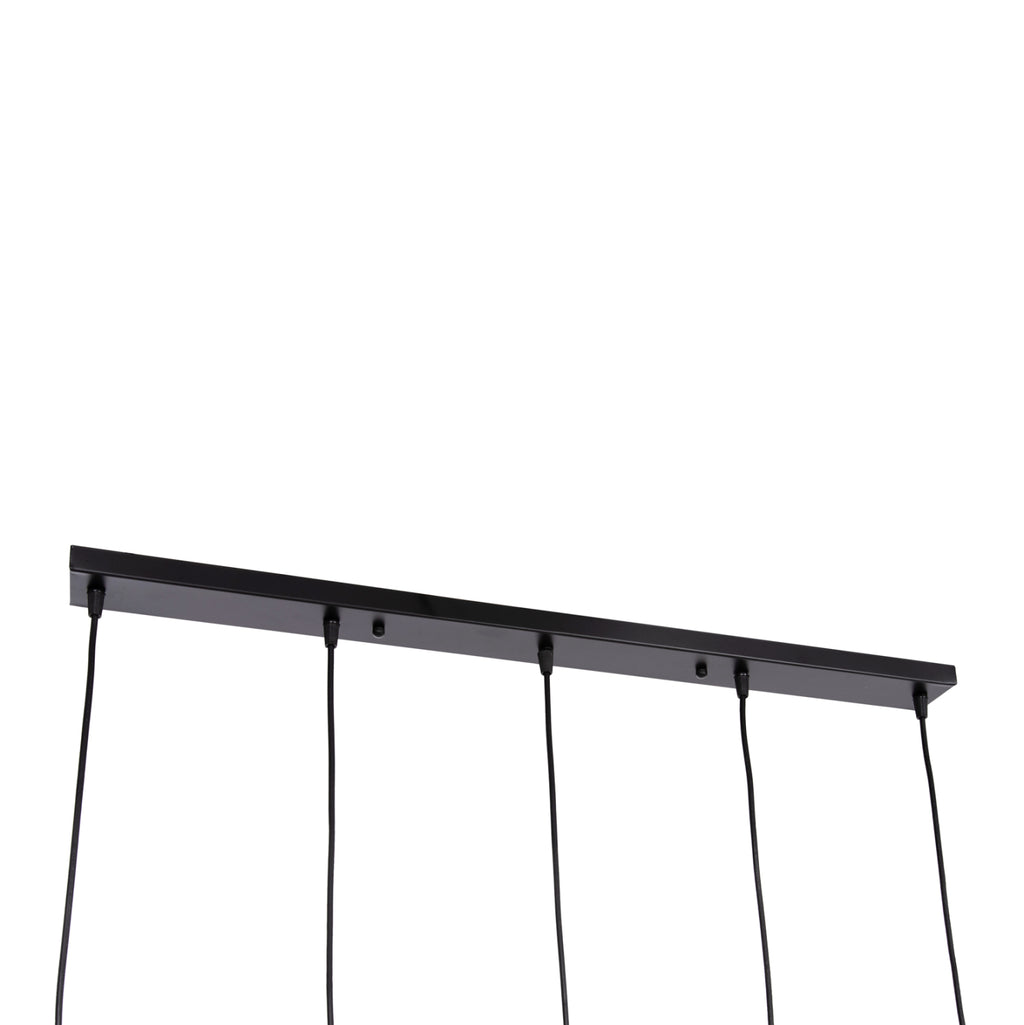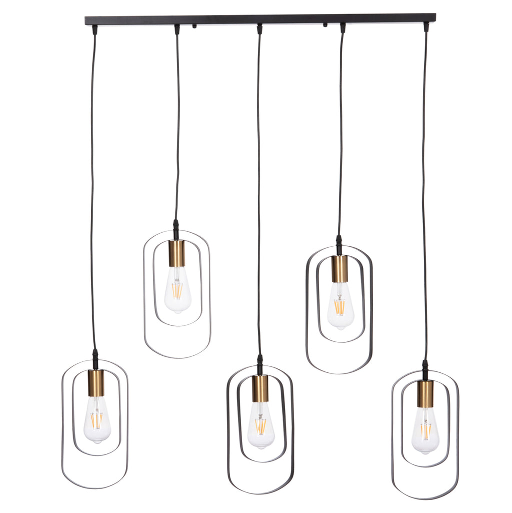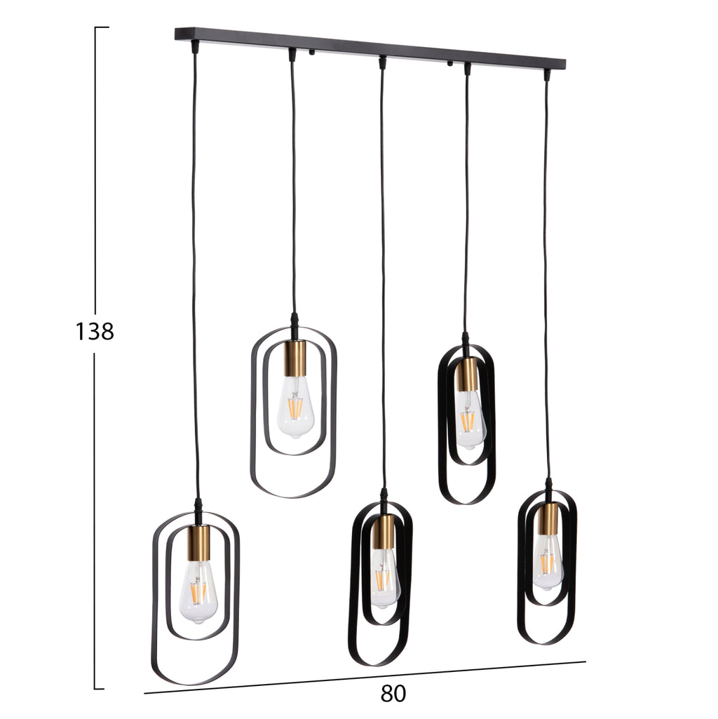 Тази висяща плафониера BIUT е висяща лампа с 5 лампи на различни редуващи се височини с черна правоъгълна таванна основа и черни висящи кабели. Лампите са поставени в златиста рамка, а това, което грабва окото, е минималистичният дизайн на шапките с двете метални рамки. ТЕХНИЧЕСКИ ХАРАКТЕРИСТИКИ: Цокъл на крушка: E27 Цокъл с обикновена крушка Тип на крушката: Препоръчително е да се използва LED Размери: 80x6x138H cm. Шапки: 16х4х30Н см. Основа: 80х6см. CE сертифицирана ПОДДРЪЖКА: Най-важното нещо за тази конкретна лампа е нейното редовно почистване от прах. * Продуктът се предлага във фабрична опаковка, без крушки. **Точното цветопредаване на продукта може леко да се различава от действителния продукт поради различни настройки на монитора. ***Продуктът е в разглобен вид и изисква монтаж и монтаж от електротехник.