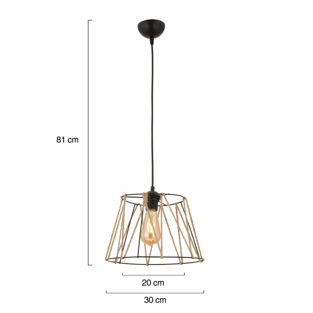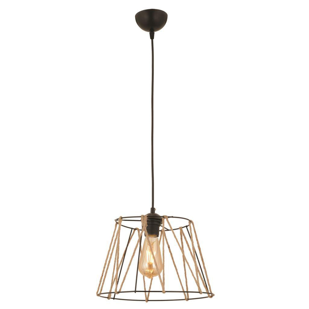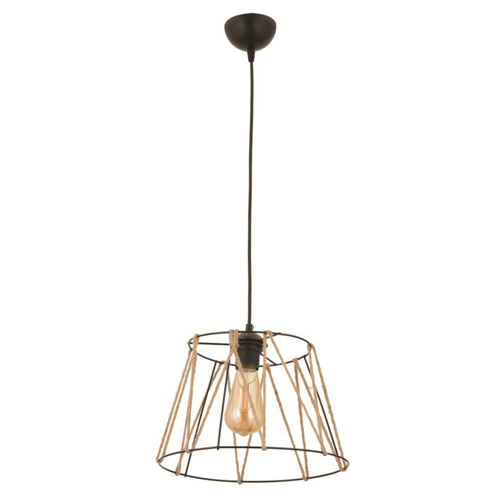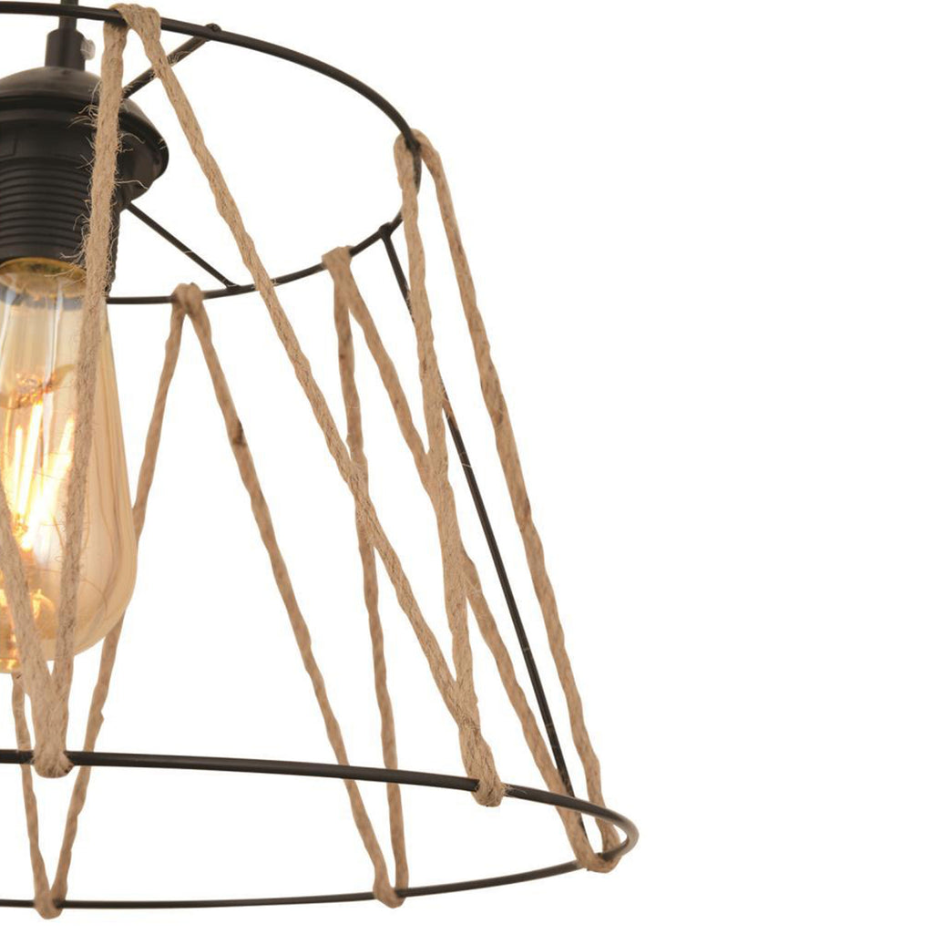 Таванна лампа изработена от метал и въже.