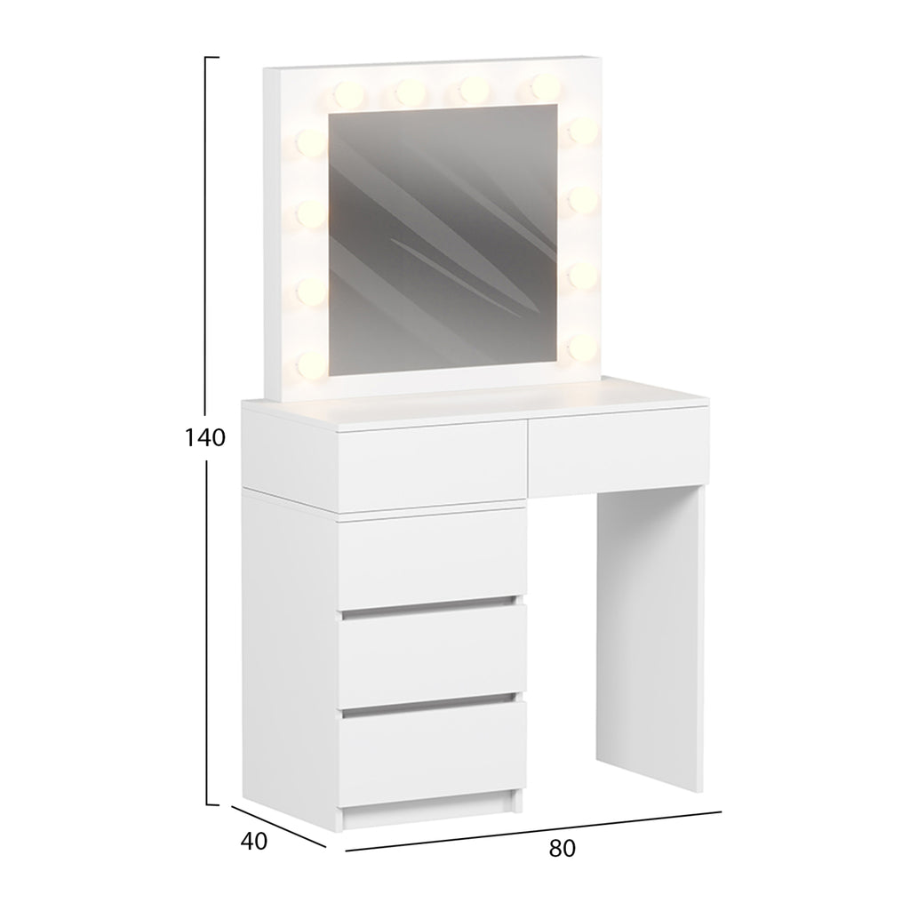 Тоалетната BEYON е още едно ново попълнение в нашата гама. Това е много практична мебел в БЯЛ цвят, която ще промени облика на вашето пространство. Състои се от маса с огледало и 5 чекмеджета. 2 дълги тесни чекмеджета под повърхността и още 3 по-големи от лявата страна като скрин. Този скрин е подвижен и позволява на останалите мебели да "стъпят" върху него и да увеличат съществено пространството в долната част, но също така създава още една повърхност за поставяне на предмети! Но това, което печели впечатленията е, че огледалото е придружено от LED светлини по периметъра, отнемащи полезността на мебелите. --LED осветлението има 3 нюанса: Топло - Нормално - Студено ---- Захранва се с USB Type-A кабел. Адаптерът НЕ е включен в комплекта! РАЗМЕРИ: 80x40x140H см. РАЗМЕРИ НА ОГЛЕДАЛОТО: 70x63cm РАЗМЕРИ НА ТЕСНИТЕ ЧЕКМЕДЖЕТА: 40x40x16.5H cm. (x2) РАЗМЕРИ НА ЧЕКМЕДЖЕТО: H cm (x3) МАТЕРИАЛИ НА ИЗРАБОТКАТА: Комплектът е изработен от 15мм меламин. Меламинът е вид дървесина под формата на ПДЧ (панел). Като материал е много издръжлив и с голяма твърдост, в резултат на което е много устойчив на драскотини, протриване и петна. ПОДДРЪЖКА: Меламинът се почиства много лесно от петна благодарение на твърдата си повърхност. Можете да избършете всички повърхности с влажна кърпа и това е достатъчно. За упорити петна можете да използвате мек почистващ препарат. *Продуктът се доставя несглобен във фабрична опаковка ** Цветопредаването на продукта може леко да се различава от фотографското изображение на вашия екран.
