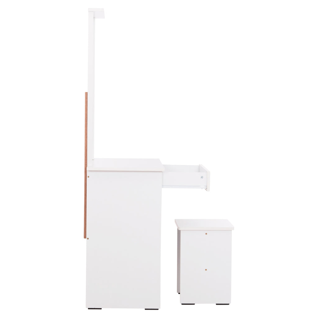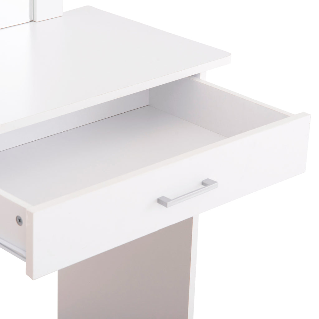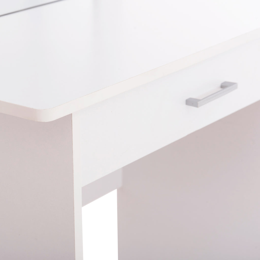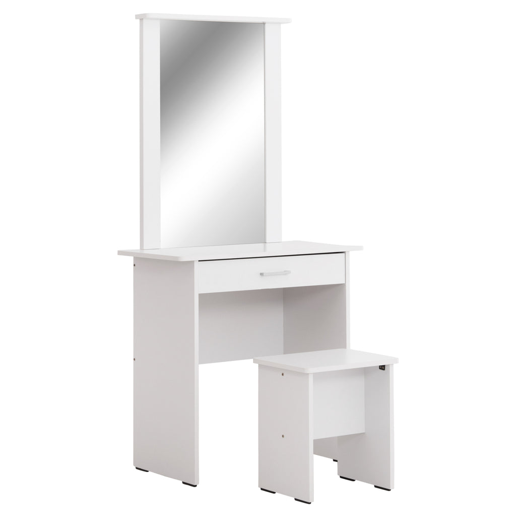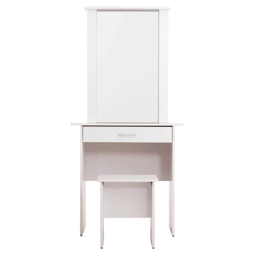 Елегантен комплект тоалетка с огледало и табуретка в изчистен бял цвят. Перфектното решение за вашата спалня, което съчетава функционалност и стил.