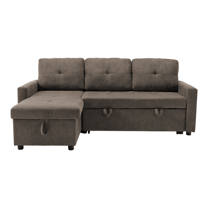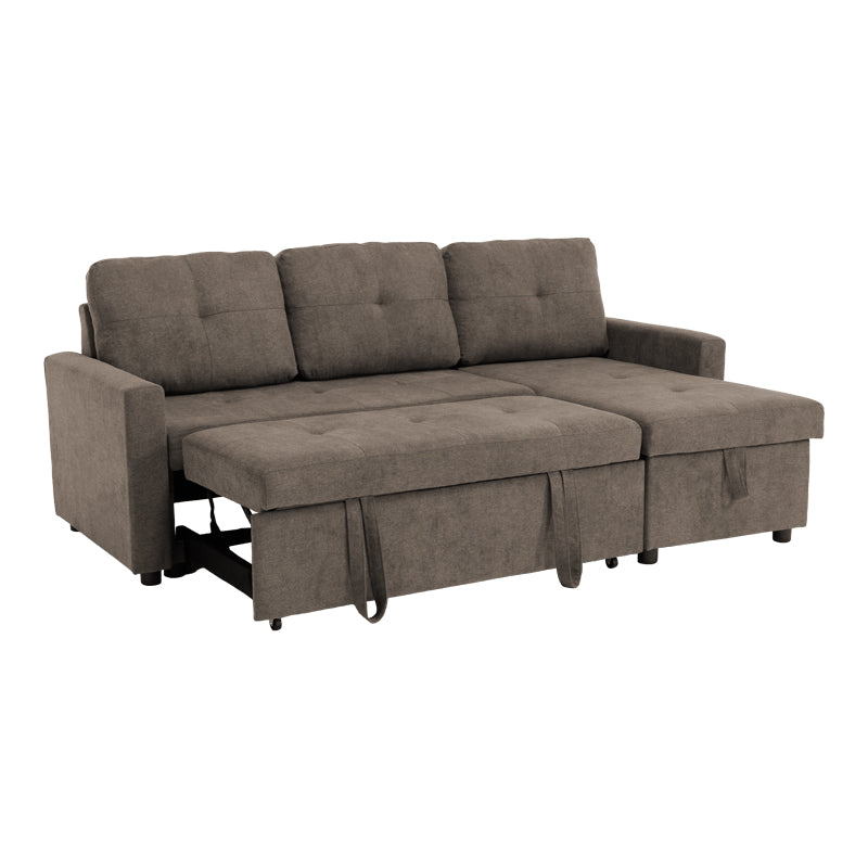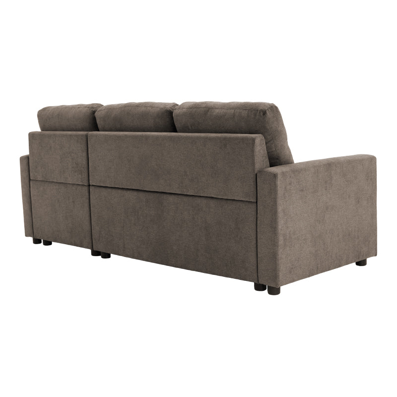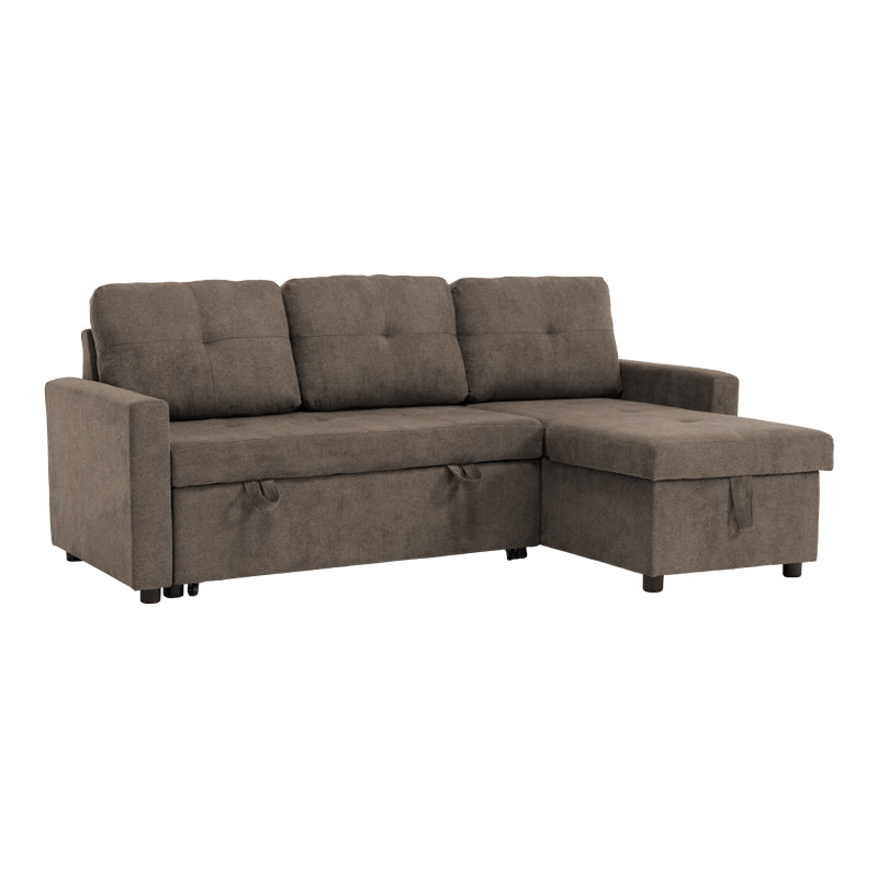 • Модерен ъглов разтегателен диван Napora в сиво-бежов плат с място за съхранение.