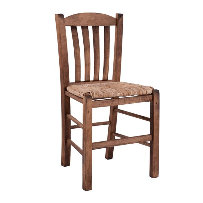 Кафе стол от масивна букова дървесина с орех и ратан. Подходящ за таверни, кафенета, но и като цяло за пространства, декорирани в класически гръцки традиционен стил. Много здрава и издръжлива рамка, изработена от 100% масивна букова дървесина. Размери: 41х35х89 см. Височина на седалката: 48см. Стол H M10376.01 е вързан с тел за по-голяма здравина и издръжливост във времето.