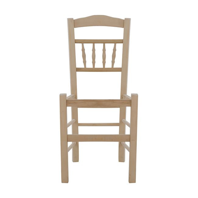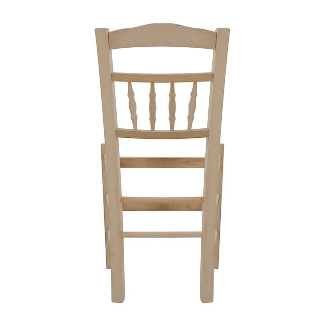 Традиционен кафе стол от небоядисана букова дървесина с конструкция. Подходящ за таверни, кафенета, но и като цяло за пространства, декорирани в класически гръцки традиционен стил. Много здрава и издръжлива рамка, изработена от 100% масивна букова дървесина. Цвят: Небоядисан Размери: 41,5х44,5х88,5см. Височина на седалката: 47,5 см.