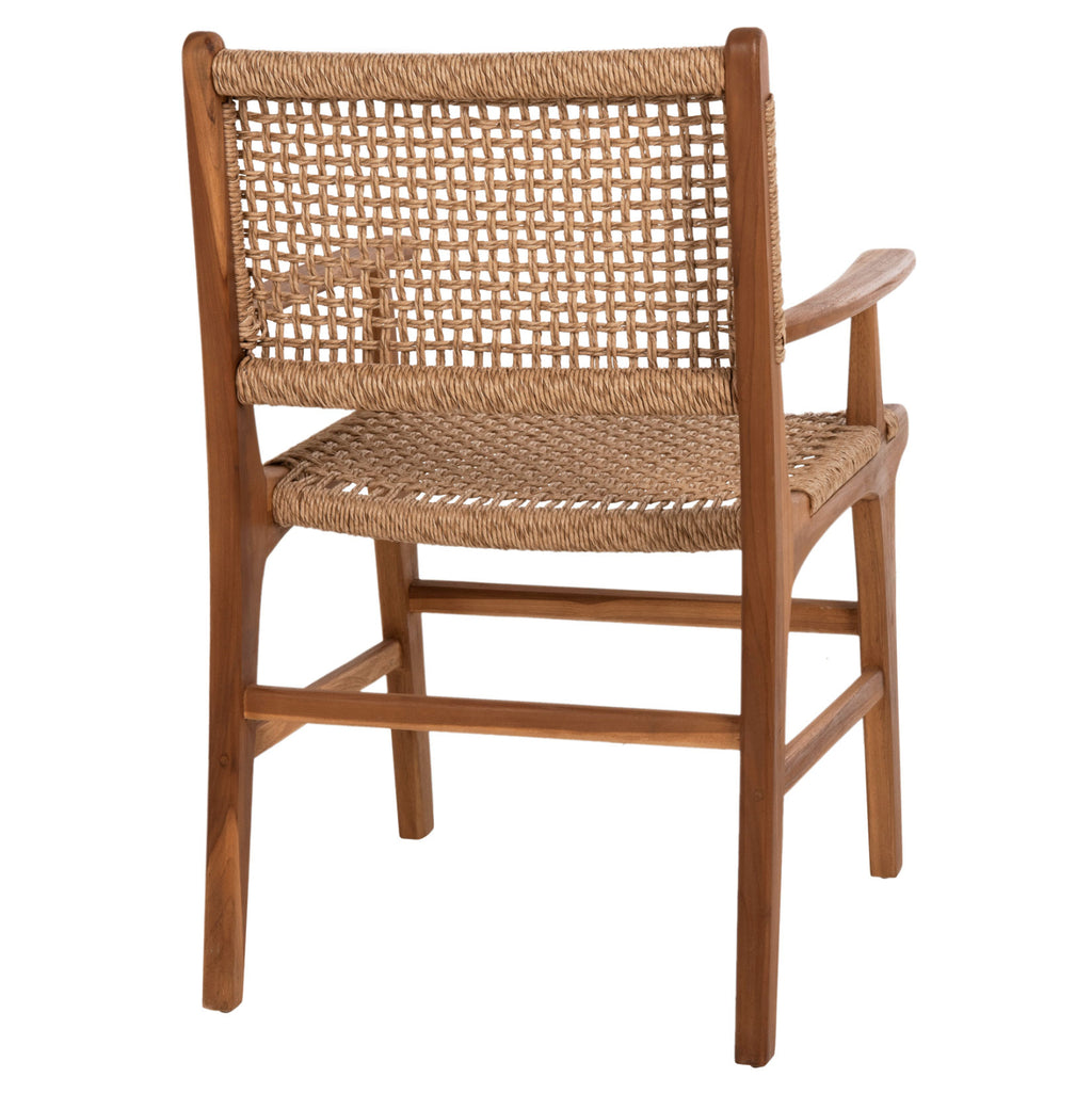 Кресло NESHA, както за професионална употреба, така и за домашно ползване е с високо качество. Красивата му рамка е изработена от качествено дърво, а облегалката със средна височина и широката седалка са изработени от майсторски изплетено синтетично VIRO въже. Дизайнерските линии на креслото са елегантни и фокусирани върху комфорта на потребителя. Дървото е с естествен цвят, който лесно се съчетава с различни декоративни мотиви. Фотьойлът идеално ще допълни маса с подобно качество и естетика и може да се използва както на закрито, така и на открито! РАЗМЕРИ: 57.5x59x87-90H см. Размери на седалката: 54,5х43,5 см. Размери на гърба: 54.5х31см. Височина на ръцете: 65 см. Височина на седалката: 47 см. Височина на крака: 43 см. Разстояние между краката: 54-48x50.5-43см. МАТЕРИАЛИ НА КОНСТРУКЦИЯТА: Рамката е изработена от висококачествено масивно тиково дърво. Когато говорим за масивно дърво, имаме предвид дървета, направени изцяло от ствола на дърво. Масивната дървесина е най-скъпият избор по отношение на дървесината, но се откроява със своята вечна естетика. Тикът е най-популярният вид твърда дървесина. Той е жълт до тъмно кафяв на цвят, изключително тежък, с висока якост, устойчив на атмосферни влияния, устойчив на стружки и не се разлага. Често водите на дървото му са силни и прави. Използва се за много вътрешни и външни конструкции. Седалката и облегалката са изработени от въже VIRO. Въжето VIRO е синтетично въже, изработено от HDPE (полиетилен с висока плътност). VIRO имитира красотата на тропическия зюмбюл, но влакната му са устойчиви на всякакви метеорологични условия и са екологични. HDPE е напълно UV устойчив, така че цветът му не избледнява на слънчева светлина. ПОДДРЪЖКА: Фактът, че ТИК е част от твърдата дървесина, го прави много лесен за поддръжка. Всичко, от което се нуждае, е почистване от прах и при необходимост почистване с влажна кърпа. Същото важи и за синтетичното въже. ПРЕДИМСТВА: •Здрава конструкция с качествени и екзотични материали •Естетически превъзходен, с класически дизайн, който ще пасне навсякъде. •Съотношение цена/качество •Доставя се сглобен, готов за употреба