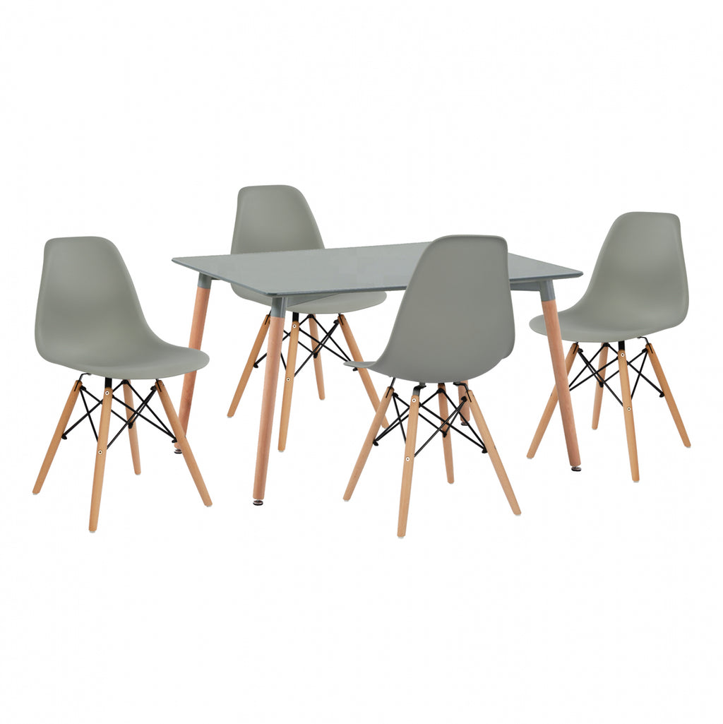 КОМПЛЕКТЪТ ВКЛЮЧВА Атрактивна модерна маса в сив цвят, тя е невероятно решение за всеки минималистичен дом. Комбинацията от сиво с крака от масивен бук го прави страхотна идея за вашата кухня. Изработен от мдф в сатенена текстура. Размери: 120х80х73 см. Четири полипропиленови стола в матирана текстура и сив цвят. Краката на стола са изработени от масивно дърво. Столът се предлага в опаковка по четири броя. Размери: 46.5x53x82 см. Височина на седалката: 43 см.