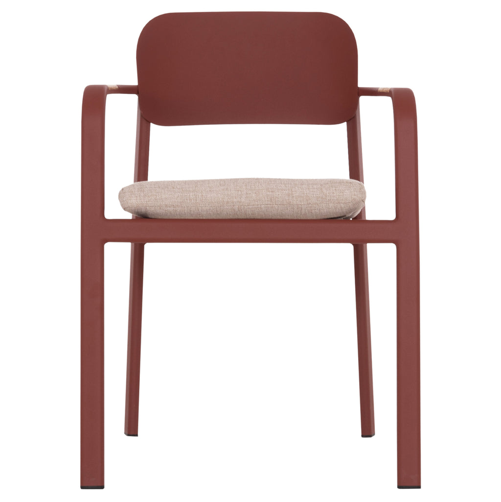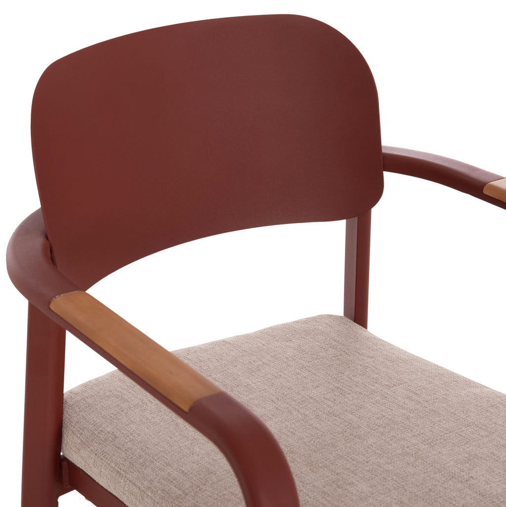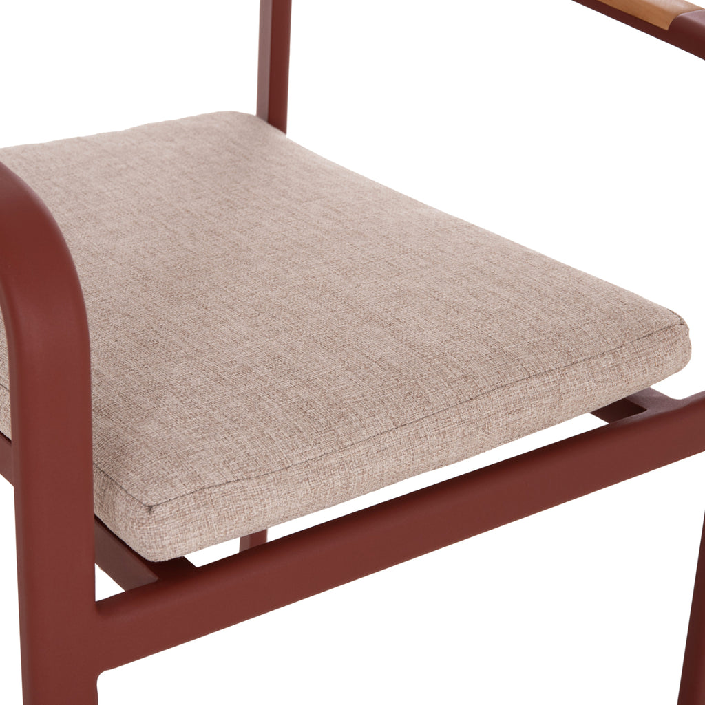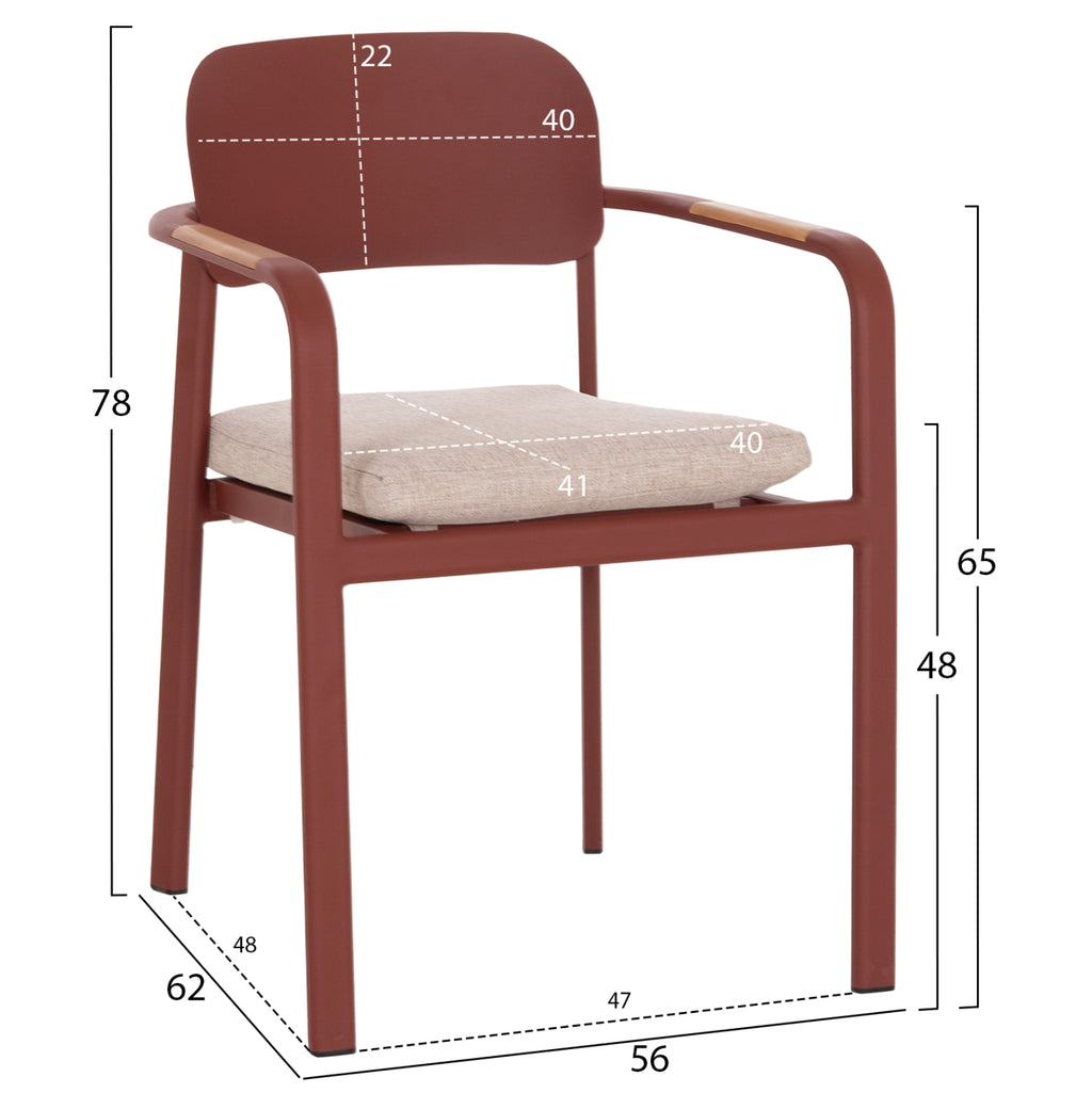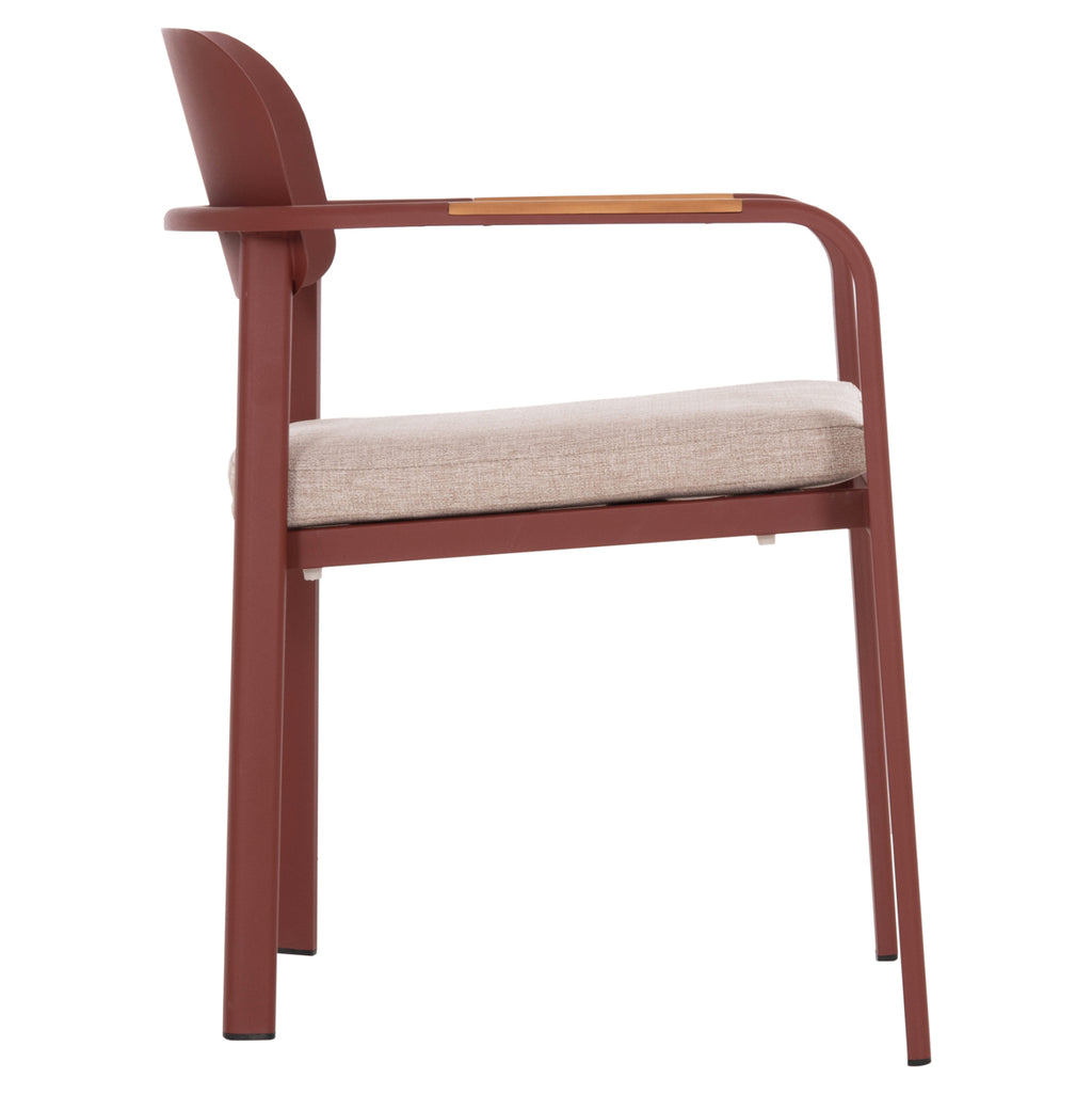 Градинският стол за хранене ELARA предлага модерна естетика, издръжлива конструкция и практична функционалност. ЧЕРВЕНАТА алуминиева рамка осигурява отлична устойчивост на външни условия, а акцентите от тиково дърво за подлакътници добавят топъл и естествен щрих. Възглавницата на седалката е изработена от плат OLEFIN в цвят BEIGE и 25D пяна за удобно сядане. Може да се подрежда един върху друг за удобно съхранение.