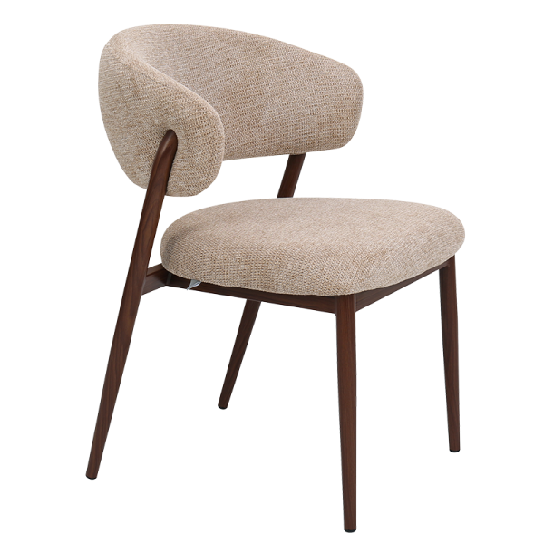Трапезен стол OMA впечатлява със своята елегантна извивка на облегалката, която плавно преминава в компактни подлакътници за по-голям комфорт. Меката дамаска и пълнежът осигуряват приятно усещане при всяко сядане, а металната основа с покритие в дървесен цвят придава завършеност и стабилност. Подходящ избор за стилно обзаведена трапезария или модерна кухня.