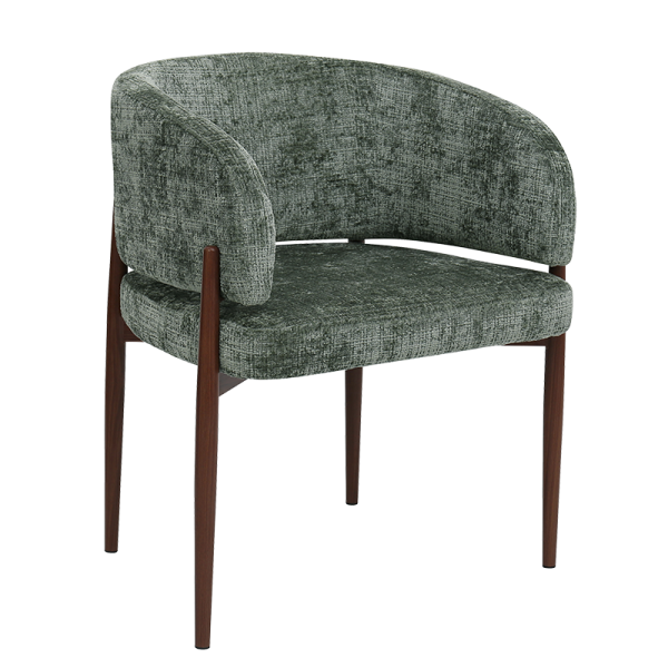 Трапезният стол RIMAR съчетава модерна визия с комфорт и прецизна изработка. Тапицираната седалка и облегалка с изчистени извивки осигуряват стабилна опора и приятна мекота при сядане. Издължените метални крака с праховобоядисано покритие в дървесен цвят допълват елегантния силует и придават изискан акцент на интериора.