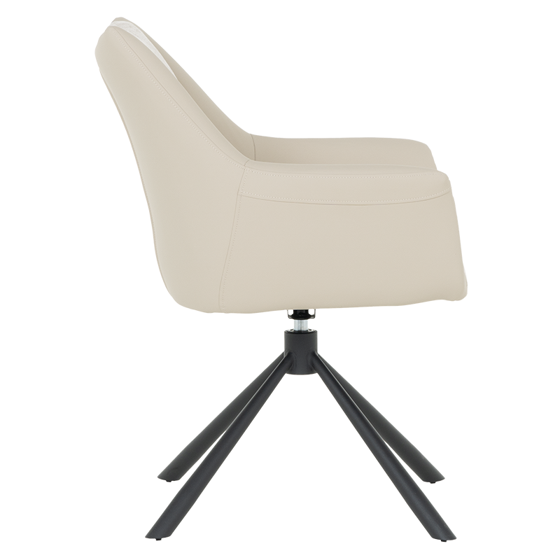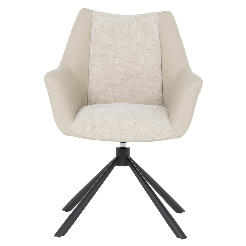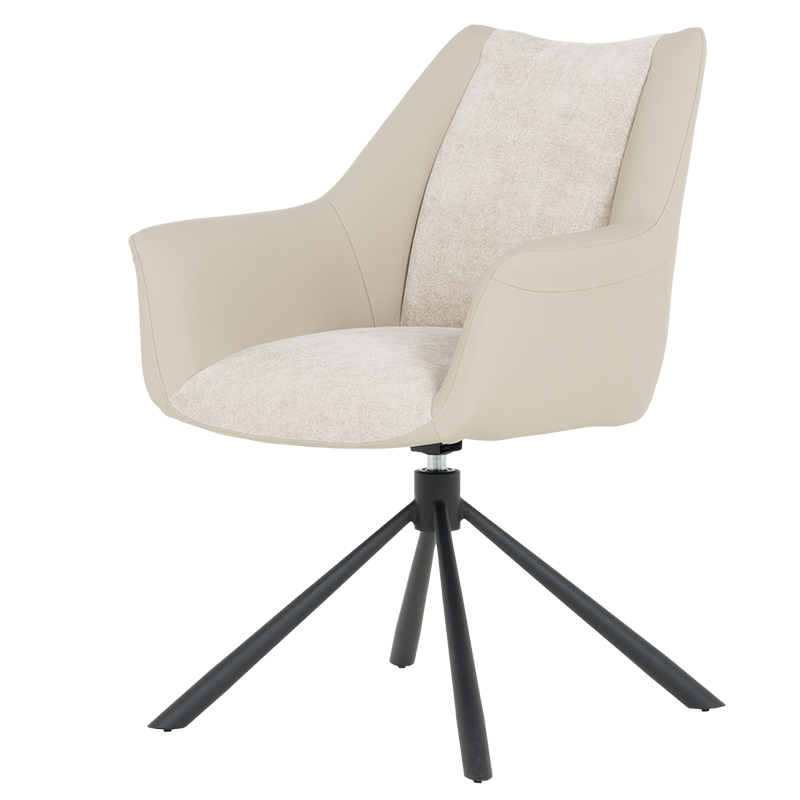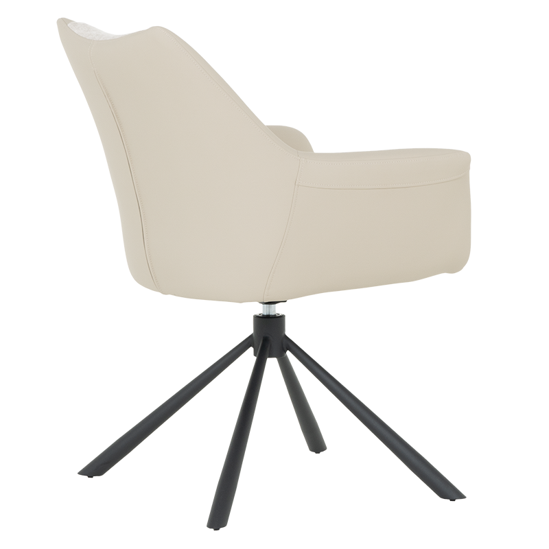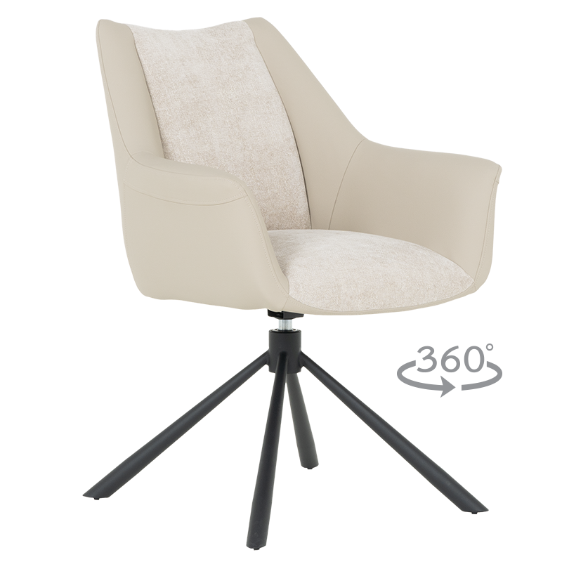 Трапезен стол TEMPE разполага с удобни подлакътници, широки седалка и облегалка, изработени от приятна на допир дамаска и висококачествена силиконова кожа. Интересната му основа е от метал, праховобоядисан в черно. Моделът има функция за въртене на седалката на 360° и връщането ѝ в изходяща позиция. Пълна информация за размерите и характеристиките на модела ще намерите в таблицата в таб/поле "Техническа информация".