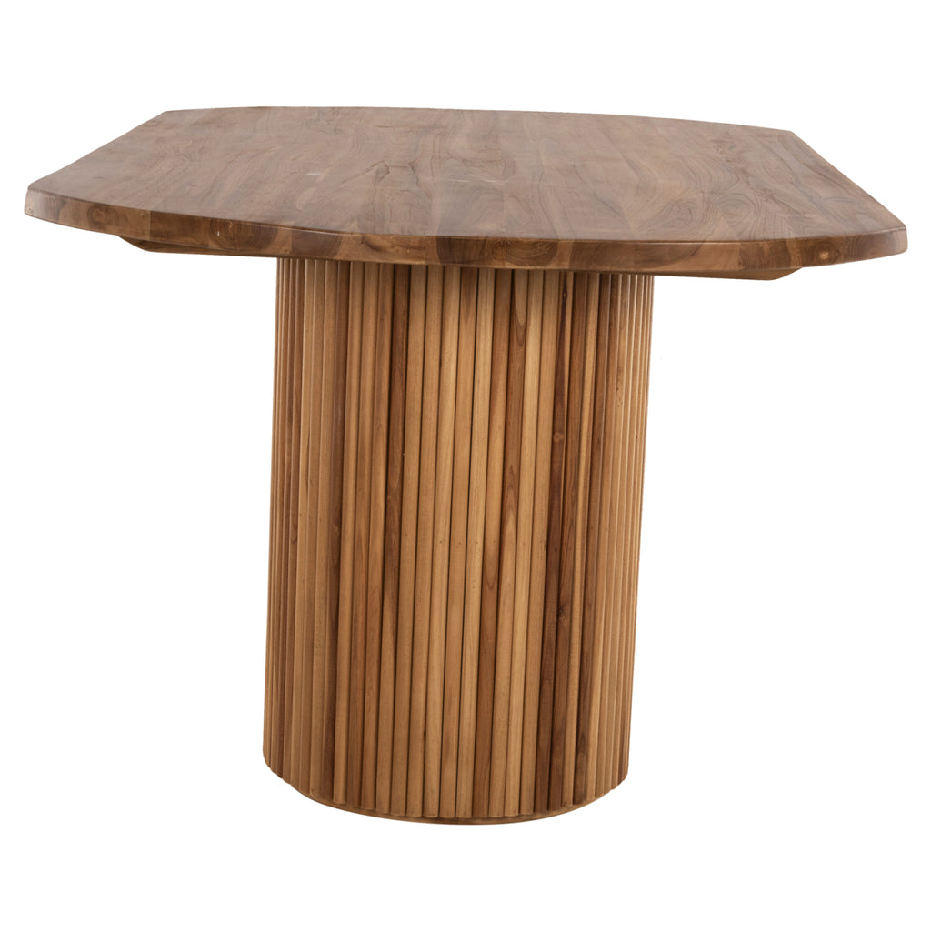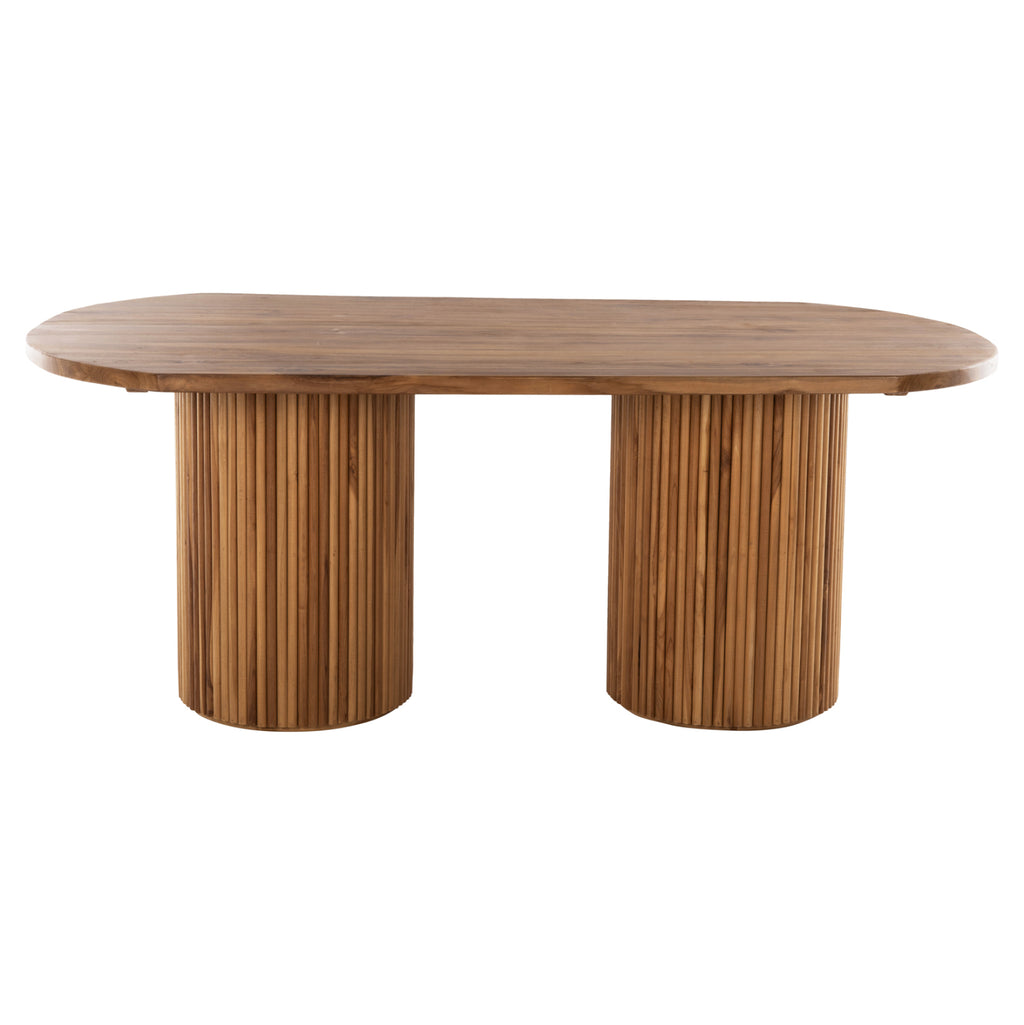 DREMA е голяма маса с овална повърхност, изработена изцяло от масивно дърво в тъмен натурален цвят. Повърхността му е с дебелина 4 см и лежи върху две цилиндрични колони от същото дърво. Маса, която ще зарадва всеки със своя размер и издръжливост. Всичко, което трябва да направите, е да намерите столовете, които ще паснат на тази прекрасна маса! ТЕХНИЧЕСКИ ХАРАКТЕРИСТИКИ: Размери: 200x110x77.5H cm Дебелина на повърхността: 4 cm. МАТЕРИАЛ НА ИЗРАБОТКА: Масата е изработена от масивно ТИКОВО дърво. Масивното дърво е вид дърво, чисто и неизбелено, традиционно използвано от дърводелците за направата на мебели. Масивната дървесина е най-скъпият избор по отношение на дървесината, но се откроява със своята вечна естетика. Ефектът, който предлага на притежателя си е наистина уникален. Тиковото дърво е най-популярният вид твърда дървесина. Той е жълт до тъмно кафяв на цвят, изключително тежък, с висока якост, устойчив на атмосферни влияния, устойчив на стружки и не се разлага. Често водите на дървото му са силни и прави. Използва се за много вътрешни и външни конструкции. --- Съществуващите пукнатини или тези, които могат да се образуват с течение на времето се дължат на свиването-разширяването на живия организъм, наречен масивна дървесина, а не са производствен дефект, придавайки оригиналност и уникален дизайн на вашето пространство. По време на производствения процес съществуващите пукнатини се изглаждат и стабилизират с материал от същата дървесина. Поради това може да има цветови вариации и разлики в размерите на продукта поради размерите на обработената дървесина. Това не са дефект на продукта. ПОДДРЪЖКА: Фактът, че ТИК е част от твърдата дървесина, го прави много лесен за поддръжка. Всичко, от което се нуждае, е почистване от прах и при необходимост почистване с влажна кърпа. ПРЕДИМСТВА: Рустик мебелите са мебели, които използват пръчки, клони или трупи за естествен вид. Терминът "рустик" идва от латинското "rusticus" (земеделец, за разлика от градско). Този стил се характеризира с естествени текстури, неутрални цветове, масивно дърво и естествена светлина. Целият този стил придава топъл и тежък чар на всяка стая. Все пак усещането за природа действа успокояващо на повечето хора. Масата DREMA е лесна за поддръжка и голямата биологична устойчивост на ТИКОВОТО дърво я прави идеален избор за множество приложения и пространства. * Цветопредаването на продукта може леко да се различава от неговото фотографско представяне на вашия екран. **Масата се доставя разглобена във фабрична опаковка