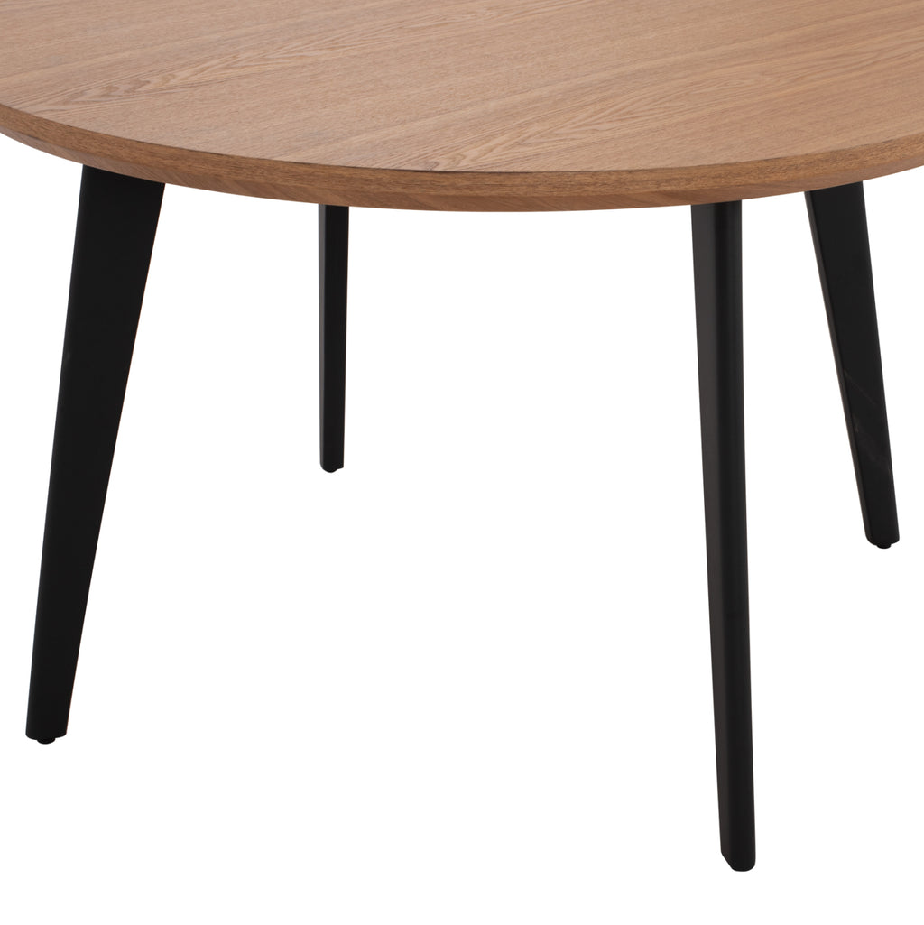 LAGERT е красива кръгла трапезна маса, с плот от MDF с дъбов фурнир в цвят МЕДЕН ДЪБ и стил рустик. Тази повърхност е "насечена" и лежи върху черна метална основа, от която започват 4-те правилни крака. Това е маса с правилни размери и красива двуцветна цветова схема, така че да може естетически да се впише в почти всяко подобно пространство.