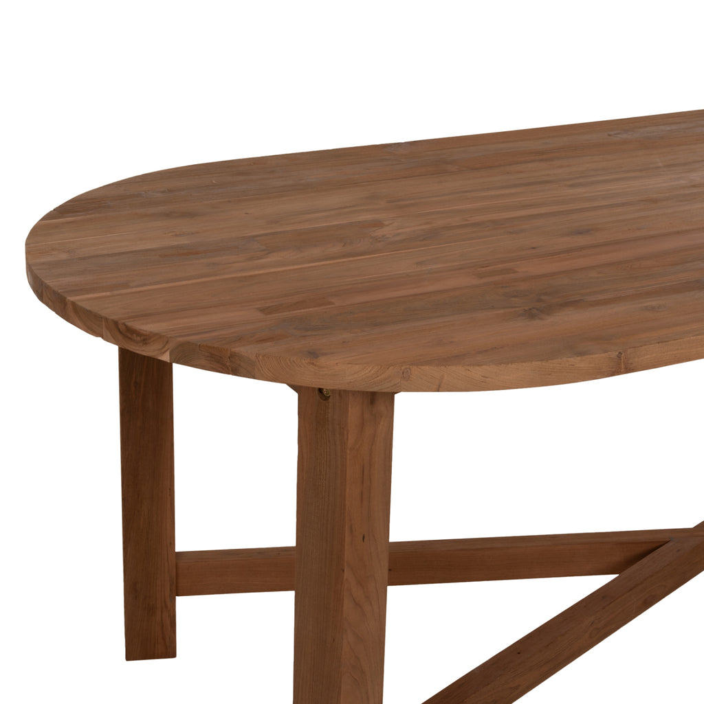 KUTAI е голяма дълга тясна маса със заоблени 4 ръба, изработена изцяло от масивно тиково дърво в естествения му цвят. 4-те крака са особено здрави и са свързани с напречни греди. Маса, която ще надстрои вашата трапезария и ще зарадва всички с размерите и издръжливостта си. Изберете подходящи столове или кресла и създайте красив комплект, за да се насладите на времето със семейството или приятелите си. ТЕХНИЧЕСКИ ХАРАКТЕРИСТИКИ: Размери: 220х100х75Н см. Дебелина на повърхността: 3см. Дебелина на крака: 8 см. Разстояние между краката: 160х58 см. МАТЕРИАЛ НА ИЗРАБОТКА: Масата е изработена от масивно рециклирано ТИКОВО дърво. Масивната дървесина е вид дървесина, чиста и неизбелена, и е най-скъпият избор в дървесния тип и се откроява със своята вечна естетика. Ефектът, който предлага на притежателя си е наистина уникален. Тиковото дърво е най-популярният вид твърда дървесина. Той е жълт до тъмно кафяв на цвят, изключително тежък, с висока якост, устойчив на атмосферни влияния, устойчив на стружки и не се разлага. Често водите на дървото му са силни и прави. Използва се за различни конструкции, както вътрешни, така и външни. ** Съществуващите пукнатини или такива, които могат да се образуват с времето се дължат на свиването-разширяването на живия организъм, наречен масивна дървесина, а не са производствен дефект, придавайки оригиналност и уникален дизайн на вашето пространство. Това не са дефект на продукта. ПОДДРЪЖКА: Фактът, че ТИК е част от твърдата дървесина, го прави много лесен за поддръжка. Всичко, от което се нуждае, е почистване от прах и при необходимост почистване с влажна кърпа. ПРЕДИМСТВА: Тези, които са почитатели на рустик стила в обзавеждането и декорацията ще останат възхитени от тази маса. Той е голям, здрав и идеален за дома, но също така и за хотели, Airbnb, заведения за обществено хранене и др. И винаги на най-ниската цена на пазара. **Масата се доставя разглобена във фабрична опаковка