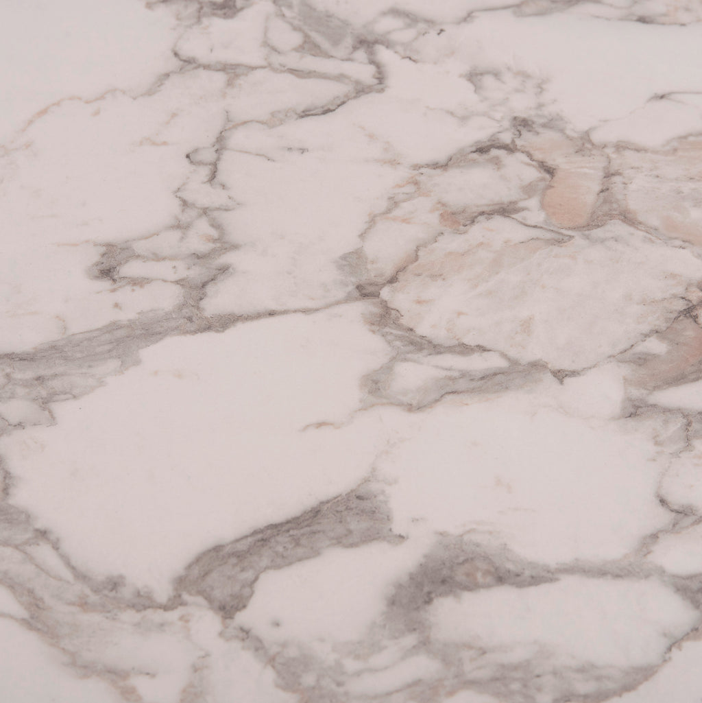 Плотът е изработен от 18 мм меламин в елегантен бял мраморен финиш, който придава луксозно излъчване на помещението. Меламинът е устойчив на надрасквания, петна и влага – идеален материал за мебели, подложени на интензивна употреба. Масата се поддържа изключително лесно – достатъчно е забърсване с влажна кърпа.