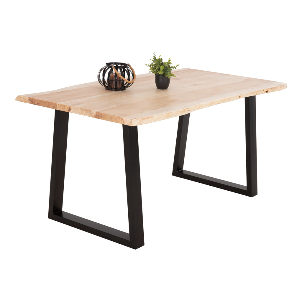 Открийте уникалната ръчно изработена маса МОНТАНА с повърхност от естествено масивно дърво АКАКА в НАТУРАЛЕН цвят. Формата е правоъгълна и лежи върху две черни метални основи с трапецовидна форма. Модерният дизайн се среща с природата и придава вечно и топло усещане на вашето пространство. СЪВЕТ: Комбинирайте го с дървена пейка или стол със същата естетика и получете трапезарията, която винаги сте искали. РАЗМЕРИ: 160x88x79Y см. ---*Размерите са ориентировъчни. Дебелина на повърхността: 3,5см. Разстояние между краката: 127.5x69.5 cm. МАТЕРИАЛИ НА КОНСТРУКЦИЯТА: Основите-крака са изработени от подсилен метал, за да могат да издържат тежестта на 3,5 см масивна дървена повърхност. Продуктът е изработен от естествено масивно дърво AKAKIAS и всеки един е уникален поради неравностите на стволовете. Когато говорим за масивно дърво, имаме предвид дървета, направени изцяло от ствола на дърво. Масивната дървесина е най-скъпият избор по отношение на дървесината, но се откроява със своята вечна естетика. Съществуващите пукнатини или тези, които могат да се образуват с течение на времето се дължат на свиването-разширяването на живия организъм, наречен масивна дървесина, а не са производствен дефект, придавайки оригиналност и уникален дизайн на вашето пространство. По време на производствения процес съществуващите пукнатини се изглаждат и стабилизират с материал от същата дървесина. Поради това МОЖЕ ДА ИМА ЦВЕТОВИ ВАРИАЦИИ И РАЗЛИКИ В РАЗМЕРИТЕ НА ПРОДУКТА поради размерите на обработената дървесина. Това не са дефект на продукта. ПОДДРЪЖКА: Масивната дървесина от всякакъв вид се счита за висококачествена. В случай на износване може да бъде ремонтиран и да издържи много години. За да почистим дървото от прах и атмосферни влияния, се нуждаем от материал, който е активен, но и достатъчно мек, за да не нарани дървото, винаги следвайки водата на дървото. *Продуктът се доставя непоръчан