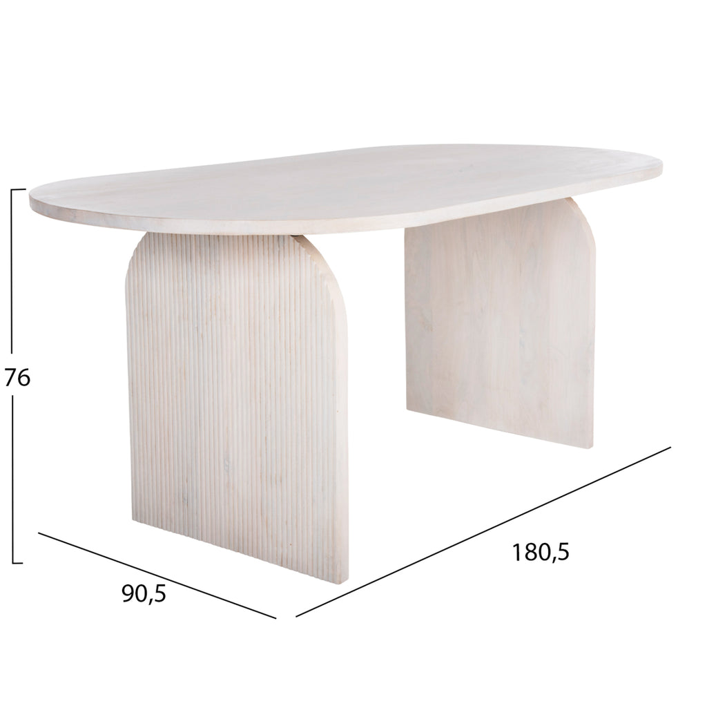 Ανακαλύψτε το τραπέζι τραπεζαρίας HONKY που είναι εξολοκλήρου κατασκευασμένο από μασίφ ξύλο mango σε ΛΕΥΚΟ χρώμα. To σχήμα είναι τυπικό οβάλ και στηρίζεται σε 2 μασίφ αψίδες από το ίδιο ξύλο και του ίδιου χρώματος. ΔΙΑΣΤΑΣΕΙΣ: 180,5x90,5x76 εκ. Πάχος επιφάνειας: 2,5 εκ. Απόσταση ποδιών: 105 εκ. Διαστάσεις ποδιών: 4x58x76 εκ. ΥΛΙΚΑ ΚΑΤΑΣΚΕΥΗΣ: Το προϊόν είναι κατασκευασμένο από φυσικό μασίφ ξύλο MANGO. Όταν αναφερόμαστε σε μασίφ, εννοούμε τα ξύλα που κατασκευάζονται ολοκληρωτικά από τον κορμό δέντρου. Το μασίφ είναι η πιο ακριβή επιλογή σε είδος ξύλου αλλά ξεχωρίζει για την διαχρονική αισθητική του. Το MANGO είναι πυκνό και δυνατό σκληρό ξύλο με ιδιαίτερα ελκυστικά νερά. Τα νερά του ξύλου του είναι μοναδικά καθώς ενσωματώνουν αρκετούς τόνους και χρώματα, που κυμαίνονται από ανοιχτόχρωμες αποχρώσεις, όπως σκούρο καφέ έως ανοιχτό ροζ ή πράσινο. Είναι ελαφρύτερο από άλλα είδη ξύλου και είναι ανθεκτικό στο νερό. Οι υπάρχουσες ρωγμές ή αυτές που ενδέχεται να δημιουργηθούν με την πάροδο του χρόνου οφείλονται στην συστολή-διαστολή του ζωντανού οργανισμού που λέγεται μασίφ ξύλο, και δεν αποτελούν κατασκευαστικό ελάττωμα, δίνοντας πρωτοτυπία και μοναδικό design στο χώρο σας. Κατά τη διαδικασία παραγωγής γίνεται ομοιομορφοποίηση και σταθεροποίηση των ρωγμών που υπάρχουν, με υλικό κατασκευασμένο από το ίδιο ξύλο. Επομένως, μπορεί να υπάρχουν χρωματικές παραλλαγές και διαφορές στις διαστάσεις του προϊόντος λόγω των διαστάσεων του επεξεργασμένου ξύλου. Αυτά δεν αποτελούν ελάττωμα του προϊόντος. ΣΥΝΤΗΡΗΣΗ: Το ΜΑΝΓΚΟ είναι ιδιαίτερα ανθεκτικό στο νερό, οπότε μπορείτε άφοβα να το καθαρίζετε με βρεγμένες πετσέτες. *To προϊόν παραδίδεται αμοντάριστο ** Η χρωματική απόδοση του προϊόντος ενδέχεται να διαφέρει ελαφρώς σε σχέση με την φωτογραφική απεικόνισή του στην οθόνη σας.