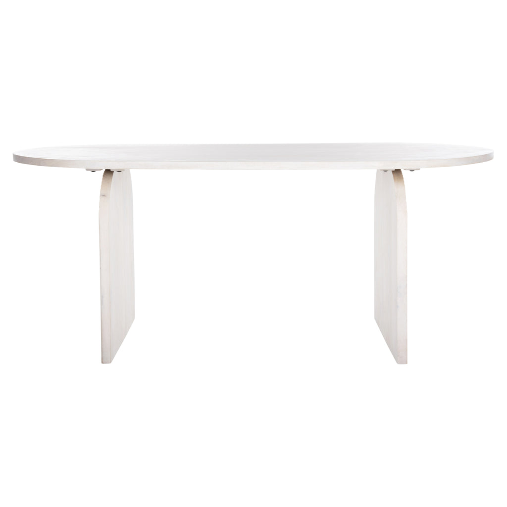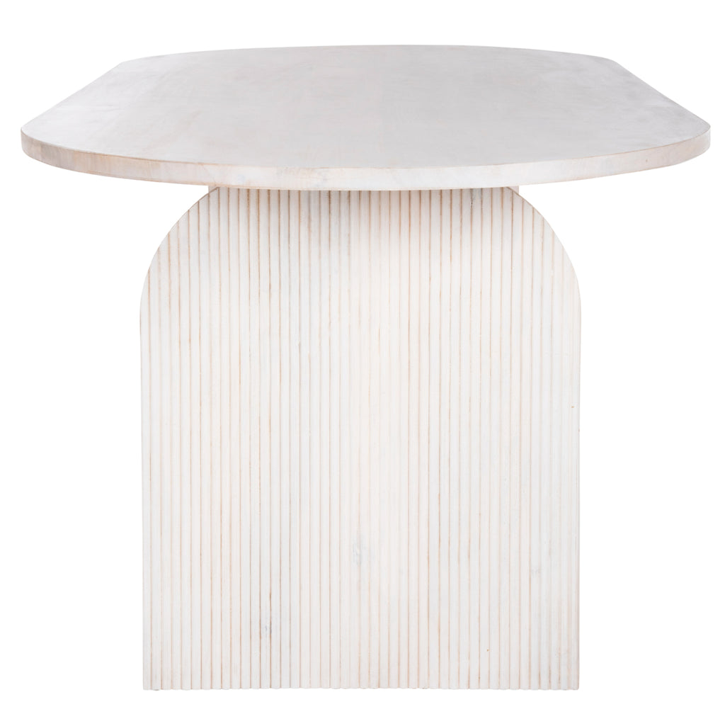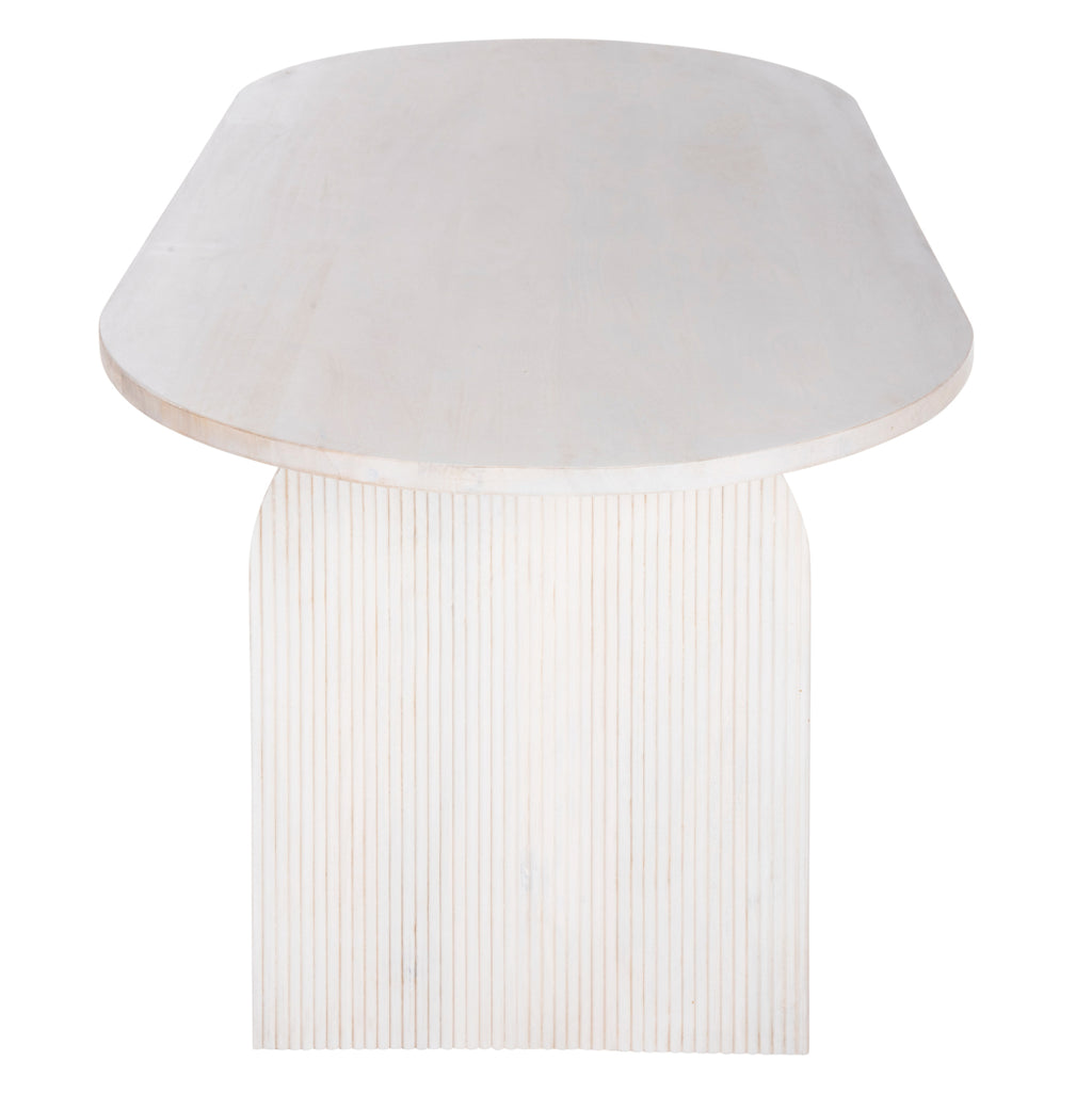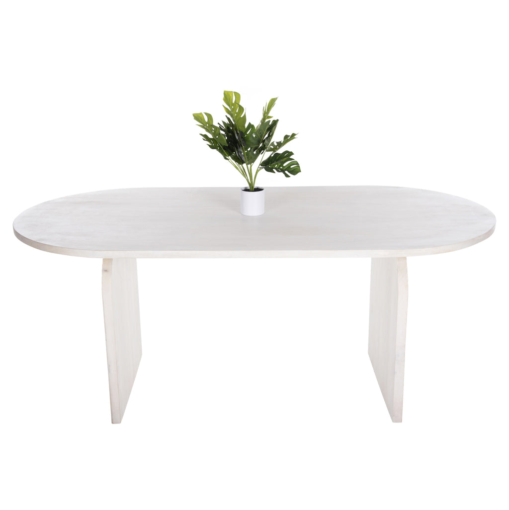 Открийте трапезната маса HONKY, която е изцяло изработена от масивно мангово дърво в БЯЛ цвят. Формата е типичен овал и се поддържа от 2 масивни арки, изработени от същото дърво и в същия цвят.