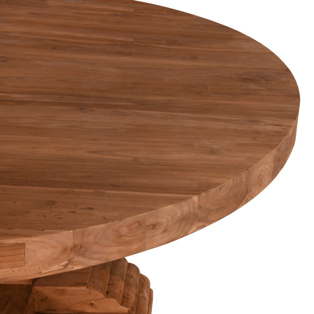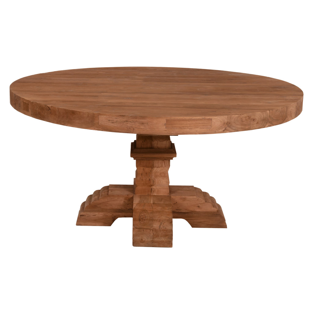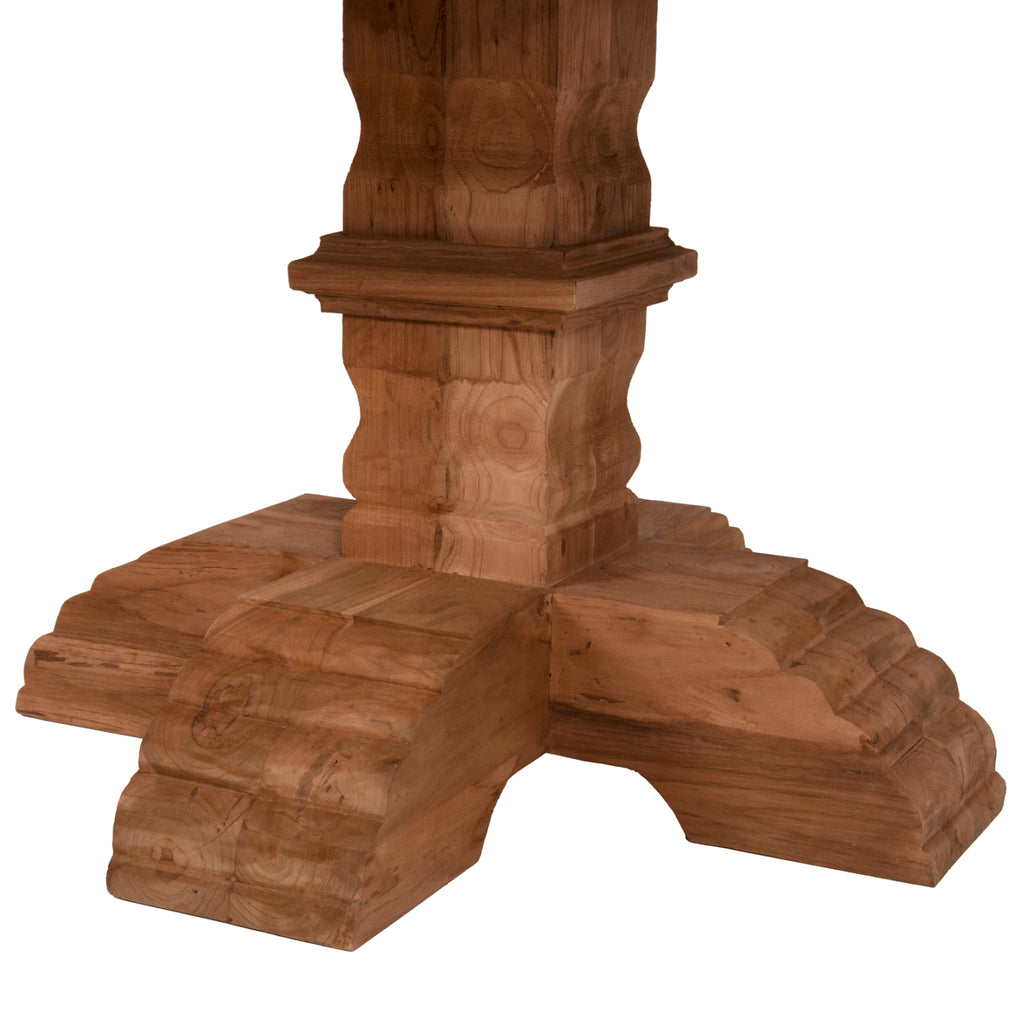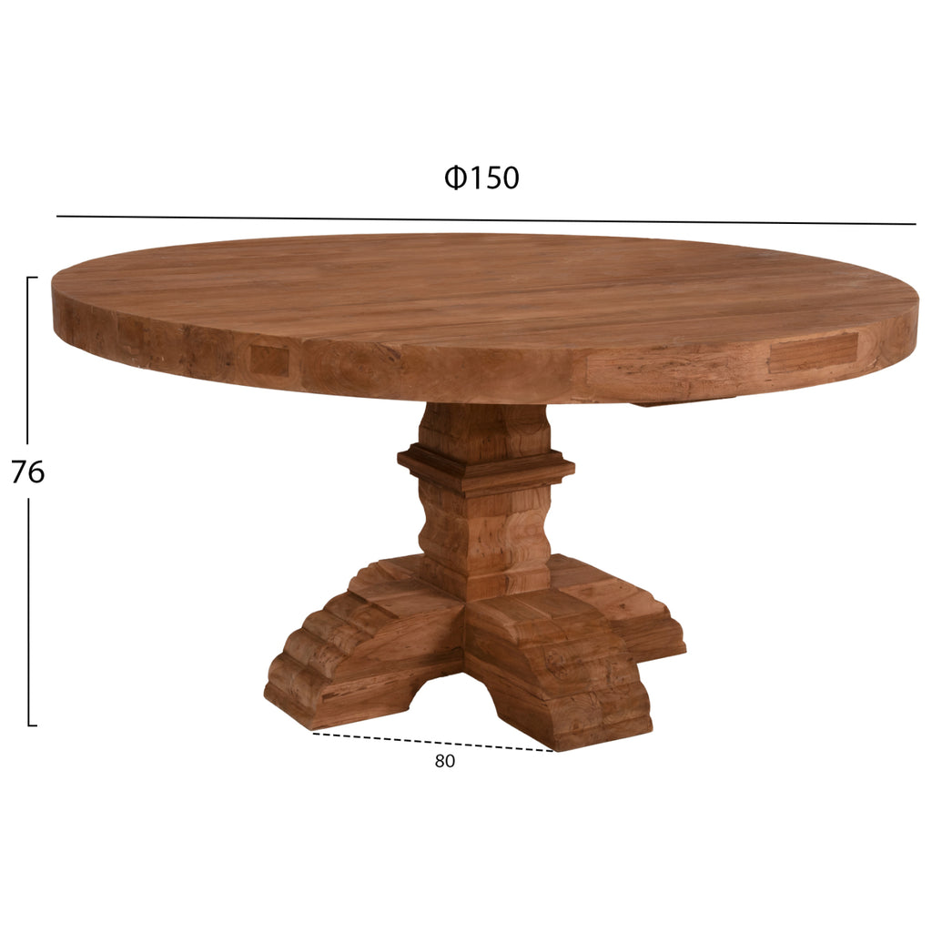 PROVENCE е кръгла трапезна маса (т.е. ротонда) за домашна и професионална употреба, с 8 см дебела дървена повърхност в естествен цвят. Цялата маса, както и колоната, която завършва на 4 фута, са от масивно дърво и са резбовани, придавайки провинциален стил. Кръглите маси са особено практични и красиви, защото нямат плотове и "водачи", нито ъгли или крака, които често създават неудобни ситуации. Тази ротонда е с големи размери, което я прави идеална за кътове за хранене. РАЗМЕРИ: Φ150 x 76H см. Дебелина на повърхността: 8см. Разстояние между краката: 80см. МАТЕРИАЛИ НА КОНСТРУКЦИЯТА: Масата е изцяло изработена от рециклирано масивно тиково дърво. Масивното дърво е вид дърво, чисто и неизбелено, традиционно използвано от дърводелците за направата на мебели. Масивната дървесина е най-скъпият избор по отношение на дървесината, но се откроява със своята вечна естетика. Ефектът, който предлага на притежателя си е наистина уникален. Тиковото дърво е най-популярният вид твърда дървесина. Той е жълт до тъмно кафяв на цвят, изключително тежък, с висока якост, устойчив на атмосферни влияния, устойчив на стружки и не се разлага. Често водите на дървото му са силни и прави. Използва се за много вътрешни и външни конструкции. ПОДДРЪЖКА: За поддръжка на ротондата е достатъчно почистване на прах на редовни интервали и минаване с мокра кърпа. За повърхността, разбира се, можете да използвате и леки почистващи препарати на пазара. ПРЕДИМСТВА: •Здрава и безопасна конструкция •Красив дизайн •Може да обслужва до 6 души •Идеален за трапезария у дома, но също така и за професионални пространства, като ресторанти, хотели и банкетни зали като цяло. Продуктът се доставя без поръчка