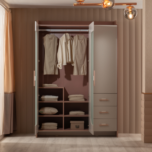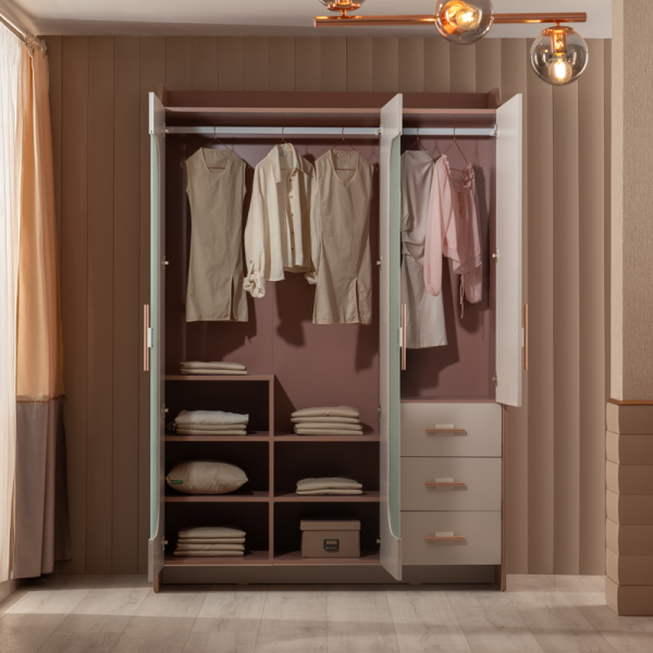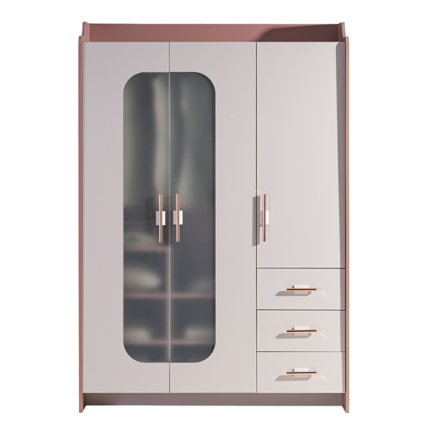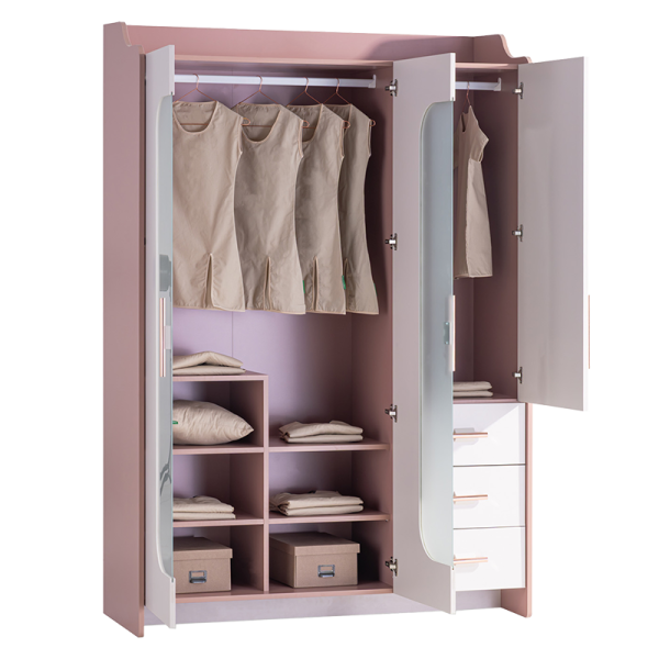 Трикрилен детски гардероб ESTELLA съчетава елегантна визия и практична функционалност – перфектен избор за стилна и подредена детска стая. Вграденото LED осветление със сензор осигурява отлична видимост в зоната за закачалки, а трите врати с тъмно тонирано темперирано стъкло добавят изискан акцент. Розово-златистите метални дръжки подчертават стилистиката и внасят нотка лукс. Моделът разполага с регулируеми рафтове и стабилни чекмеджета с плавно затваряне, всяко с товароносимост до 25 кг. За допълнителна свежест и защита на дрехите са предвидени две вентилационни отвора.