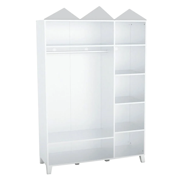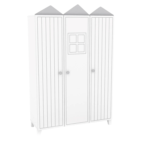 Детският трикрилен гардероб MIAMI впечатлява с оригинален дизайн, напомнящ фасада на приказни къщички. Просторното вътрешно оформление включва голям лост за закачалки, шест стабилни и подвижни рафта с товароносимост до 25 кг, както и плавно затваряне на вратите за повече комфорт и безопасност. LED осветлението придава допълнителна уютна атмосфера, а металните дръжки и отворената основа, подходяща за робот прахосмукачка, допълват функционалността.