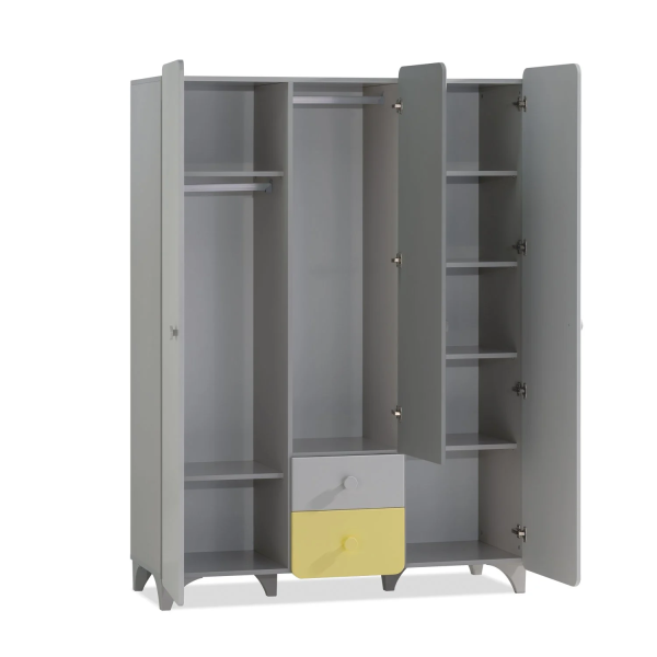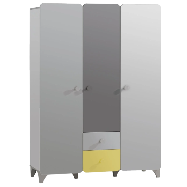 Трикрилен гардероб MINIA ви позволява да съхранявате подредени дрехи и играчки. Благодарение на трите отделения спокойно може да приберете голяма част от вещите в детската стая. Моделът разполага с два лоста за закачалки, 4 просторни рафта с товароносимост до 25 кг и 2 чекмеджета. Всички вратички разполагат с механизъм за плавно затваряне, което ги прави безопасни и безшумни.