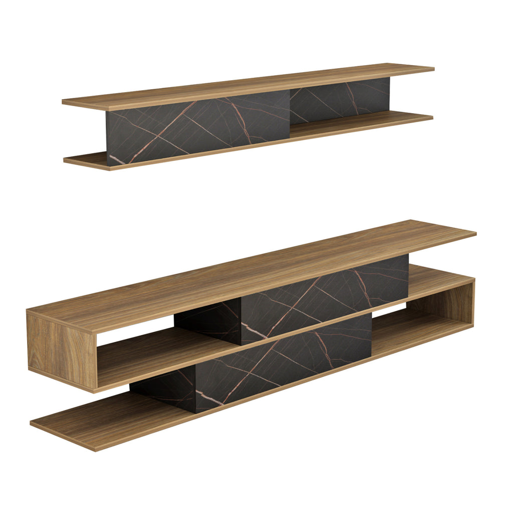 BIRGITTA е модерна и функционална ТВ композиция, която ще разкраси всекидневната Ви! Състои се от 2 части. Подовата мебел, която в допълнение към отворените пространства в модерен дизайн, разполага и с 2 шкафа с врати, които се отварят надолу, и стенен рафт с подобна естетика. Композицията се предлага в красив двуцветен ЧЕРЕН МРАМОР-НАТУРАЛ и ще повдигне имиджа на вашия хол. РАЗМЕРИ: Подови мебели: 181x31.5x39.6cm Рафт: 150x22x19.5cm Дебелина на меламин: 15 mm. (1,5 см) МАТЕРИАЛИ НА ИЗРАБОТКА: Цялата мебел е изработена от висококачествен меламин. Меламинът е вид дървесина под формата на ПДЧ. ПДЧ са продукти, които имат формата на плоча (панел). Това е синтетичен материал с много твърда повърхност, което го прави много устойчив на драскотини, абразия и петна. ПОДДРЪЖКА: Меламинът се почиства много лесно от петна благодарение на твърдата си повърхност. Можете да избършете всички повърхности с влажна кърпа и това е достатъчно. За упорити петна можете да използвате мек почистващ препарат. *ПРОДУКТЪТ СЕ ПРЕДЛАГА НЕМОНТИРАН ВЪВ ФАБРИЧНАТА ОПАКОВКА **Точното цветопредаване на продукта може леко да се различава от действителния продукт поради различни настройки на монитора.