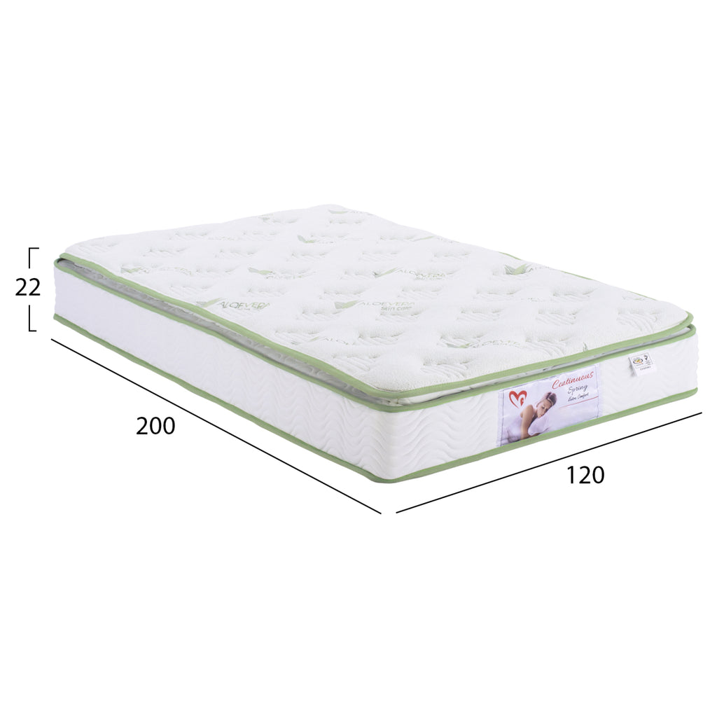 Матрак с непрекъснати пружини (бонел) в еднослойни и едностранни размери, с интегриран горен слой с АЛОЕ ВЕРА. Матракът е средство за благополучие и релаксация. Човек със здравословен сън сменя позицията си на сън до шестдесет пъти на нощ (за да избегне мускулни и ставни болки). Възможността за смяна на позицията, без да бъде възпрепятстван, е необходимо условие за освежаващ сън. Равномерното разпределение на натиска предотвратява болката в тялото там, където може да има най-голям натиск (рамене, бедра) и гарантира добро кръвообращение. Отличната регулация на температурата (нито твърде горещо, нито твърде студено) и влажността (абсорбция на потните течности) са перфектно съобразени с индивида. Най-важното нещо, което трябва да запомните обаче, е, че степента на твърдост на матрака трябва да се регулира според личните ви предпочитания. Ето защо различните скали за твърдост, които се разпространяват, не отразяват напълно вашата реалност. Този конкретен матрак е изработен с традиционната и най-издръжлива конструкция на матрака. Те се състоят от множество пружини от един и същи вид и твърдост, свързани в решетка. Тази решетка е сърцето на матрака и е отговорна за това как ще се разпредели теглото. Матраците Bonnell обикновено са по-твърди от матраците с независими джобни пружини и матраците от пяна. Топ-матракът се нарича горната част на матрака или самия матрак „топ-матрак“. Но какво означава това на практика и какво предлага тази допълнителна повърхност на тялото? По същество топ-матракът е повърхностен слой от мек материал, който е зашит и опакован в калъфа. Това осигурява меко усещане, подобно на „облак“, върху повърхността на матрака. Топ-матраците са започнали като топ матрак (и като тънки матраци или подложки за матрак), които се поставят върху матрак като допълнителна подплата. След това са започнали да се адаптират като обикновени повърхности за матраци, до степен, че днес могат да се комбинират с почти всеки матрак със или без пружини. Какви са предимствата на топ-матрака? Топ-матракът е по-мек и по-кадифен по отношение на усещането, което оставя върху тялото. В повечето модели те са по-меки от матрака и в почти всички случаи допринасят за увеличаване на височината на матрака. ТЕХНИЧЕСКИ ХАРАКТЕРИСТИКИ: (за повече подробности вижте съответната снимка) Размери: 120x200 см. Височина на матрака: 22 см. - Плат (плетен)--------------------------- - Пяна-------------------------------------- - 3,5 см. вълнообразна пяна.-----Ватиран -Нетъкан плат--------------------------- горна част на възглавницата - 3 см пяна-------------------------- - Нетъкан плат------------------------- - 700 гр. памучна вата - 700 гр. памучна вата - 17 см. височина на непрекъснатата пружина - Твърда вата -Нетъкан плат -Брой пружини: 12x37 пружини -Общ брой пружини: 444 МАТЕРИАЛИ НА КОНСТРУКЦИЯТА: Повърхността на матрака е изработена от плетен плат, направен от влакна от кактус алое вера, които имат милиони микроклетки, които при контакт с кожата се разкъсват, освобождавайки терапевтичните съставки на растението Алое Вера и имат благоприятен ефект по време на сън. След това следва слой пяна. Вътрешната част на матрака се състои от пяна с висока плътност с вълнообразен дизайн, така че да се поддържат разстоянията между останалите материали, като същевременно се осигурява правилната им вентилация. Отдолу е нетъкан текстил, който е полипропиленова тъкан, нет
