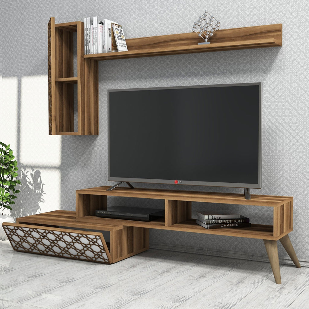 ΜΜ9518.04 е модерен и практичен телевизор в цвят ОРЕХ И БЯЛО, който ще краси всекидневната Ви! Състои се от основната мебел на пода, която е с правоъгълна форма и стъпва на два крака в единия край и шкаф с БЯЛА врата и красиви дървесни шарки в другия край. Композицията е завършена с дълъг тесен стенен шкаф с БЯЛА вратичка с дървесни мотиви и рафт отвътре и дълъг стенен рафт отвън. Композиция, която ще придаде на вашия хол наистина красив и модерен вид. РАЗМЕРИ: ОСНОВНО ОБЗАВЕЖДАНЕ: Дължина: 150см. Височина: 37,8 см. Дълбочина: 37,2 см. ПОДОВ ШКАФ: Дължина: 70см. ---- Дълбочина: 37,2 см. СТЕНЕН РАФТ: Дължина: 120см. Височина: 11,8 см. Дълбочина: 16,1см. СТЕНЕН ШКАФ: Дължина: 20см. Височина: 70 см. Дълбочина: 22см. Дебелина на меламина: 18 мм. (1,8 см) ------- CNC релеф: 4 мм дебелина (това е дървесният модел на вратите на шкафа) МАТЕРИАЛИ ЗА ПРОИЗВОДСТВО: Цялата мебел е изработена от висококачествен меламин. Меламинът е вид дървесина под формата на ПДЧ (панел). Като материал е много издръжлив и с голяма твърдост. Така че това е синтетичен материал с много твърда повърхност, което го прави много устойчив на драскотини, абразия и петна. Носещите крака на основната мебел са изработени от подсилен полиетилен. ПОДДРЪЖКА: Меламинът се почиства много лесно от петна благодарение на твърдата си повърхност. Можете да избършете всички повърхности с влажна кърпа и това е достатъчно. За упорити петна можете да използвате мек почистващ препарат. ПРЕДИМСТВА: Тази композиция е красива и разбира се практична. Основната мебел може да бъде фиксирана към стената за още по-голяма стабилност. Изработен от качествени материали, които го правят лесен за поддръжка, той е идеално предложение за дома на цена, която няма да ви позволи да търсите другаде! ПРОДУКТЪТ СЕ ПРЕДЛАГА РЕЗМОНТИРАН ВЪВ ФАБРИЧНАТА ОПАКОВКА