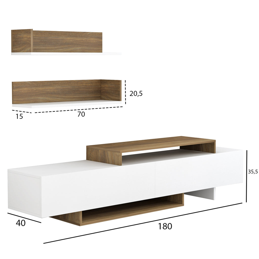 EDUARDO е модерна телевизионна композиция, която ще разкраси вашия хол! Състои се от 2 части. Подовата мебел с 2 шкафа (бели) и рафт и стенна композиция с 2 независими рафта, с подобна естетика. Композицията идва в красив двуцветен БЯЛ-НАТУРАЛ и ще повдигне имиджа на вашия хол. РАЗМЕРИ: Размери на подовата мебел: 180x29.5x45Y cm Рафтове за стена: 60 cm. Дебелина на меламина: 15 мм. (1,5 см) МАТЕРИАЛИ НА ИЗРАБОТКА: Цялата мебел е изработена от висококачествен меламин. Меламинът е вид дървесина под формата на ПДЧ. ПДЧ са продукти, които имат формата на плоча (панел). Това е синтетичен материал с много твърда повърхност, което го прави много устойчив на драскотини, абразия и петна. ПОДДРЪЖКА: Меламинът се почиства много лесно от петна благодарение на твърдата си повърхност. Можете да избършете всички повърхности с влажна кърпа и това е достатъчно. За упорити петна можете да използвате мек почистващ препарат. *ПРОДУКТЪТ СЕ ПРЕДЛАГА НЕМОНТИРАН ВЪВ ФАБРИЧНАТА ОПАКОВКА **Точното цветопредаване на продукта може леко да се различава от действителния продукт поради различни настройки на монитора.