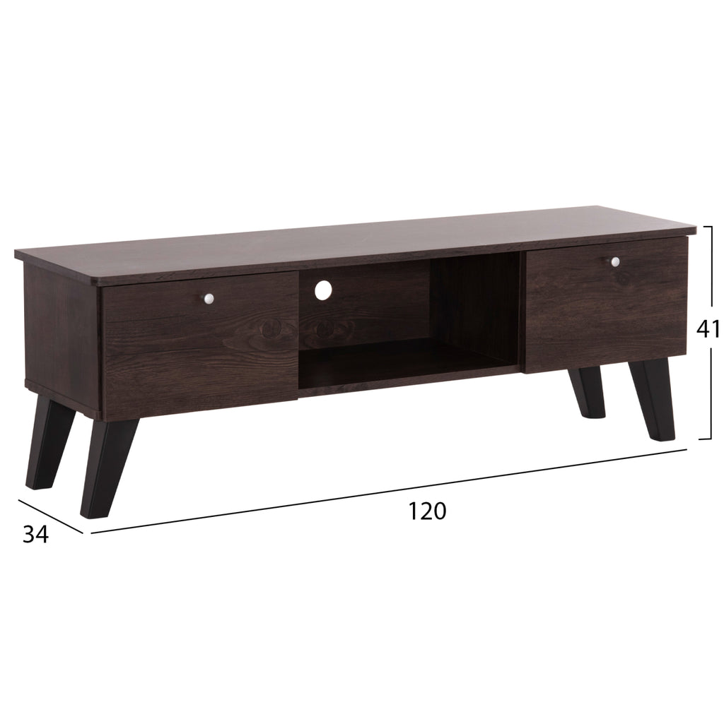 Меламиновият ТВ шкаф IREN в цвят ОРЕХ със сребристи дръжки и ЧЕРНИ крака е добре проектиран и семпъл. Има две шкафчета отляво и отдясно и отворено пространство в центъра. Практично и красиво предложение, което ще ви помогне да поддържате хола си подреден. РАЗМЕРИ: 120x32.5-34x41Y см. Чекмеджета: 33x24x21Y см. Отвор: 45x29.5x21Y см. Разстояние между краката: 119.5-112x26-19 см. МАТЕРИАЛ НА ИЗРАБОТКА: Мебелите са изработени изцяло от меламин. Меламинът е синтетичен материал, много издръжлив и с голяма твърдост. ПОДДРЪЖКА Меламиновата конструкция го прави устойчив на абразия, надраскване и петна. Освен това се почиства лесно с влажна кърпа. *Продуктът се доставя несглобен ** Цветопредаването на продукта може леко да се различава от фотографското представяне на вашия екран.