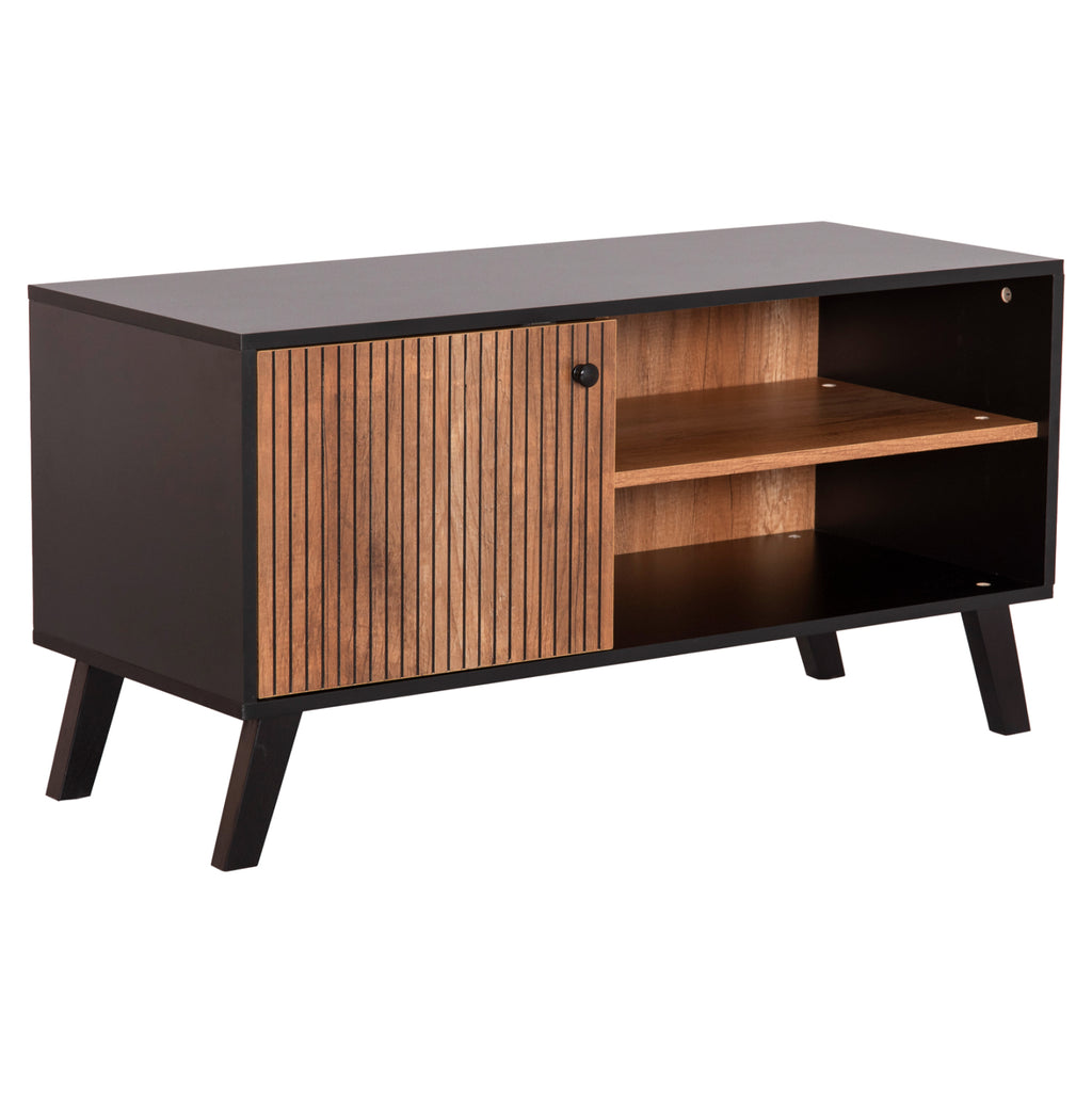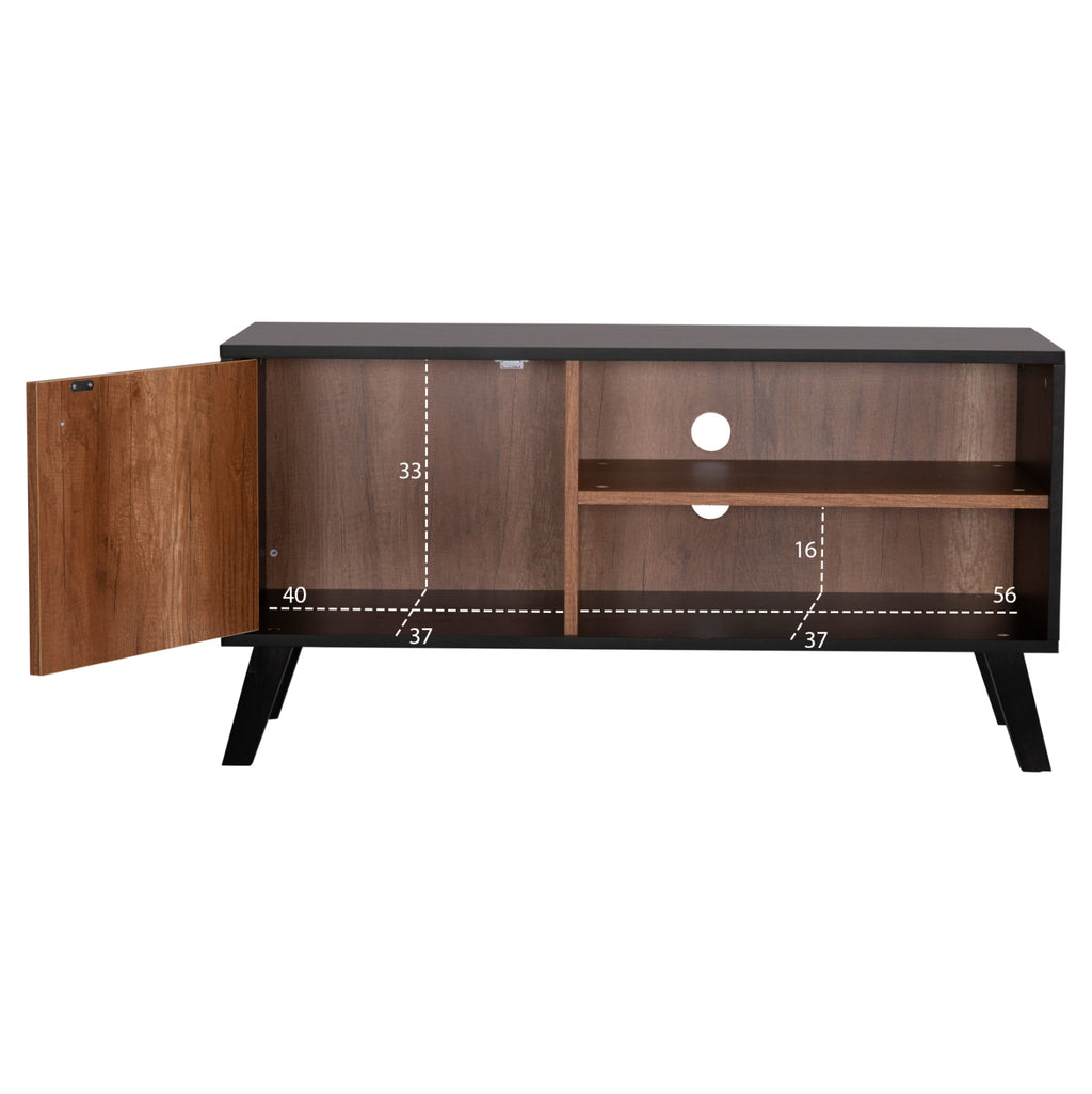 KRUDEN е модерен и функционален ТВ шкаф, който ще украси всекидневната Ви! Той е сравнително малък и има 1 шкаф и отворено място за съхранение с рафт. Цветовете на мебелите са черно, което е и цвета на повърхността и естествено дърво, което е цвета на шкафа и етажерката. Това е елегантно и удобно предложение за всекидневни без особено голямо пространство! РАЗМЕРИ: 100x40x51Y см. Шкаф: 40x37x33H см. Рафтове: 56x37x16H см. Височина на крака: 15 см. Дебелина на меламина: 15 мм. (1,5 см) МАТЕРИАЛИ НА ИЗРАБОТКА: Цялата мебел е изработена от висококачествен меламин. Меламинът е вид дървесина под формата на ПДЧ. Като материал е много издръжлив и с голяма твърдост, в резултат на което е много устойчив на драскотини, протриване и петна. Краката са от масивна букова дървесина. ПОДДРЪЖКА: Меламинът се почиства много лесно от петна благодарение на твърдата си повърхност. Можете да избършете всички повърхности с влажна кърпа и това е достатъчно. За упорити петна можете да използвате мек почистващ препарат. *ПРОДУКТЪТ СЕ ПРЕДЛАГА НЕМОНТИРАН ВЪВ ФАБРИЧНАТА ОПАКОВКА ** Цветопредаването на продукта може леко да се различава от фотографското представяне на вашия екран.
