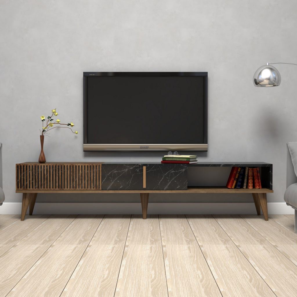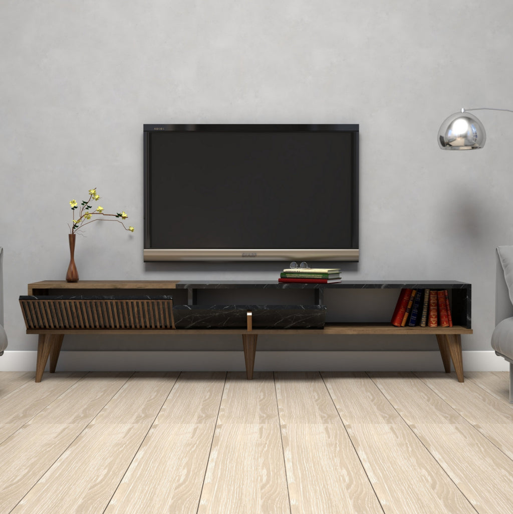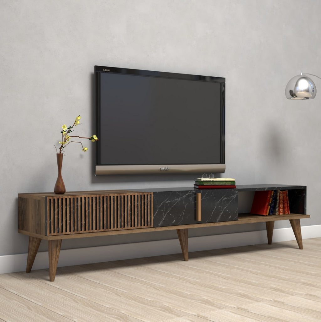 Το КГ9512.02 είναι ένα μοντέρνο και λειτουργικό έπιπλο τηλεόρασης από μελαμίνη σε συνδυασμό χρωμάτων ΚΑΡΥΔΙ και ΟΨΗ ΜΑΥΡΟΥ ΜΑΡΜΑΡΟΥ, που θα ομορφύνει το σαλόνι σας! Είναι μακρύ και διαθέτει 3 ισομεγέθεις χώρους ως κύριο χώρο αποθήκευσης ή τοποθέτησης αντικειμένων. Οι δύο από αυτούς είναι ντουλάπια, που ανοίγουν κατακόρυφα. Τα πόδια είναι ψηλά και στο ίδιο χρώμα με την υπόλοιπη κατασκευή. Οι διαστάσεις του επίπλου είναι κατάλληλες για όλες τις τηλεοράσεις εάν θέλετε η τηλεόρασή σας να στηρίζεται σε βάση. Πρόκειται για μια κομψή πρόταση για το σαλόνι σας! ΔΙΑΣΤΑΣΕΙΣ: Μήκος: 180 εκ. Ύψος: 40 εκ. Βάθος: 35 εκ. Πάχος μελαμίνης: 18 χλστ. (1,8 εκ.) Ύψος ποδιών: 20 εκ. ΥΛΙΚΑ ΚΑΤΑΣΚΕΥΗΣ: Ολόκληρο το έπιπλο είναι κατασκευασμένο από μελαμίνη εξαιρετικής ποιότητας. Η μελαμίνη είναι είδος ξύλου σε μορφή μοριοσανίδας(panel). Ως υλικό είναι πολύ ανθεκτικό και με μεγάλη σκληρότητα. Άρα, πρόκειται για ένα συνθετικό υλικό με πολύ σκληρή επιφάνεια, με αποτέλεσμα να είναι πολύ ανθεκτική στις γρατζουνιές, στην τριβή και τους λεκέδες. Τα πόδια είναι από ενισχυμένο πολυαιθυλένιο με επένδυση ξύλου. ΣΥΝΤΗΡΗΣΗ: Η μελαμίνη καθαρίζεται πάρα πολύ εύκολα από τους λεκέδες χάρη στην σκληρή της επιφάνεια. Μπορείτε να σκουπίσετε όλες τις επιφάνειες με ένα υγρό πανί και αυτό είναι αρκετό. Σε επίμονους λεκέδες μπορείτε να χρησιμοποιήσετε ένα ήπιο καθαριστικό. ΠΛΕΟΝΕΚΤКГΑΤΑ: Αυτό το έπιπλο τηλεόρασης είναι όμορφο και φυσικά πρακτικό. Μπορεί να συνδυαστεί με πολλά στυλ διακόσμησης χάρη στα χρώματά του. Επίσης, μπορεί να στερεωθεί στον τοίχο για ακόμα μεγαλύτερη σταθερότητα. Μια ιδανική πρόταση για το σπίτι με τιμή που δεν θα σας αφήσει να κοιτάξετε αλλού! ΤΟ ΠΡΟΙΟΝ ΔΙΑΤΙΘΕΤΑΙ ΑΜΟΝΤΑΡΙΣΤΟ ΣΕ ΕΡΓΟΣΤΑΣΙΑΚΗ ΣΥΣΚΕΥΑΣΙΑ
