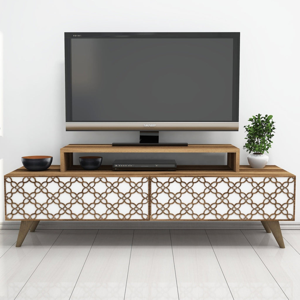 ΜΜ9510.04 е модерен и функционален меламинов ТВ шкаф в цвят ОРЕХ И БЯЛО, който ще разкраси всекидневната Ви! Той е дълъг и има два еднакви по размер шкафа като основно място за съхранение или поставяне на вещи. Предната част на шкафовете, които се отварят вертикално, е украсена с машинно изработени (CNC релеф) и красиви симетрични дизайни. Отгоре на основната повърхност все още има по-малка основа, върху която се поставя телевизорът, докато отдолу има място за поставяне на други устройства. Краката са относително високи. Размерите на мебелите са подходящи за всички телевизори, ако желаете вашият телевизор да стои на стойка. Това е елегантно предложение за вашия хол! РАЗМЕРИ: Дължина: 140см. Височина: 48,8 см. Дълбочина: 41,8 см. Дебелина на меламина: 18 мм. (1,8 см) -------CNC релеф: 4 мм КОНСТРУКТИВНИ МАТЕРИАЛИ: Цялата мебел е изработена от висококачествен меламин. Меламинът е вид дървесина под формата на ПДЧ (панел). Като материал е много издръжлив и с голяма твърдост. Така че това е синтетичен материал с много твърда повърхност, което го прави много устойчив на драскотини, абразия и петна. Краката са изработени от здрав и качествен полиетилен. ПОДДРЪЖКА: Меламинът се почиства много лесно от петна благодарение на твърдата си повърхност. Можете да избършете всички повърхности с влажна кърпа и това е достатъчно. За упорити петна можете да използвате мек почистващ препарат. ПРЕДИМСТВА: Тази стойка за телевизор е красива и разбира се практична. Може да се комбинира с много стилове на декорация благодарение на цветовете си. Може да се фиксира и към стената за още по-голяма стабилност. Идеално предложение за дома на цена, която няма да ви позволи да търсите другаде! ПРОДУКТЪТ СЕ ПРЕДЛАГА РЕЗМОНТИРАН ВЪВ ФАБРИЧНАТА ОПАКОВКА