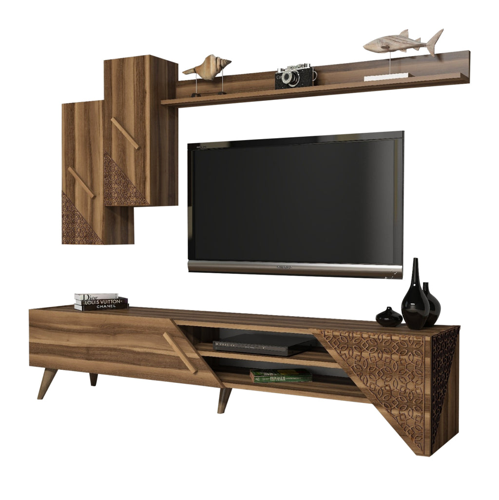 ΜΜ9514.02 е модерен и функционален телевизор, който ще разкраси вашия хол! Състои се от основна подова мебел, която от едната страна има отворено място за съхранение с рафт и е украсена с машинно изработени шарки (CNC релеф), а от другата страна има шкаф с дълга тясна дръжка. Композицията е завършена с 2 стенни шкафа в еднаква естетика и дълга стена. Това е едно елегантно и същевременно впечатляващо предложение за вашия хол с доминиращ цвят ОРЕХ! РАЗМЕРИ: ОСНОВНО ОБЗАВЕЖДАНЕ: Дължина: 180см. Височина: 40см. Дълбочина: 37см. СТЕНЕН РАФТ: Дължина: 120см. Височина: 11,8 см. Дълбочина: 16,1см. СТЕННИ ШКАФОВЕ: Дължина: 26,4см. Височина: 63 см. Дълбочина: 22см. Дебелина на меламина: 18 мм. (1,8 см)-----CNC релеф: 4 мм КОНСТРУКТИВНИ МАТЕРИАЛИ: Цялата мебел е изработена от висококачествен меламин. Меламинът е вид дървесина под формата на ПДЧ. Като материал е много издръжлив и с голяма твърдост. Така че това е синтетичен материал с много твърда повърхност, което го прави много устойчив на драскотини, абразия и петна. Краката са изработени от подсилен полиетилен. ПОДДРЪЖКА: Меламинът се почиства много лесно от петна благодарение на твърдата си повърхност. Можете да избършете всички повърхности с влажна кърпа и това е достатъчно. За упорити петна можете да използвате мек почистващ препарат. ПРЕДИМСТВА: •Модерна и впечатляваща конструкция •Качествени материали •Големи размери •Възможност за фиксиране на стена за още по-голяма стабилност ПРОДУКТЪТ СЕ НАЛИЧЕН РЕЗМОНТИРАН ВЪВ ФАБРИЧНА ОПАКОВКА