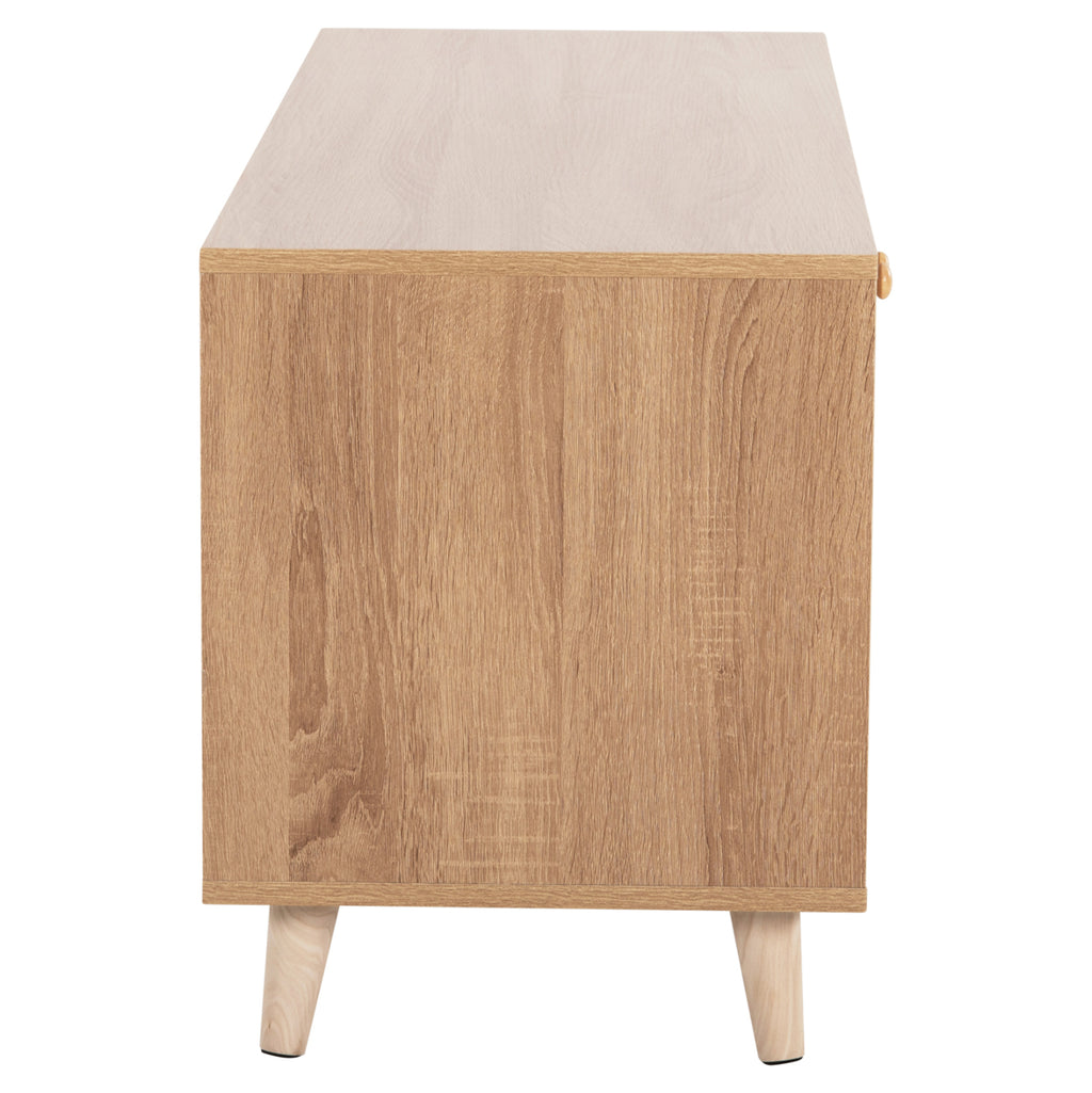 Меламиновата стойка за телевизор RILLION в цвят SONAMA е практична мебел за предназначението си. Има дървени крака, а от едната страна има шкаф с 2 врати и овални прозорци от полупрозрачен поликарбонатен материал. От другата страна има 4 отворени рафта под формата на кубчета. РАЗМЕРИ: 120x40x51Y см. МАТЕРИАЛИ НА ИЗРАБОТКА: Мебелите са изработени от меламин с дебелина 15 мм. Меламинът е вид дървесина под формата на ПДЧ. ПДЧ са продукти, които имат формата на плоча (панел). Като материал е много издръжлив и с голяма твърдост. Така че това е синтетичен материал с много твърда повърхност, което го прави много устойчив на драскотини, абразия и петна. Краката са от масивно дърво. ПОДДРЪЖКА: Много лесно се почиства от петна благодарение на издръжливите си материали. Можете да избършете всички повърхности с влажна кърпа и това е достатъчно. За упорити петна можете да използвате мек почистващ препарат. *Продуктът се доставя несглобен във фабрична опаковка **Точното цветопредаване на продукта може леко да се различава от действителния продукт поради различните настройки на всеки монитор.