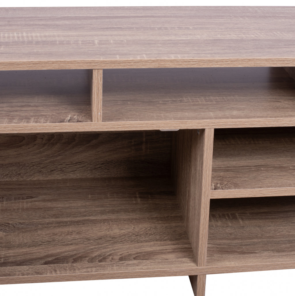 ТВ шкаф в нюанс сонама-сив 123x39,5x35,5-45,5Y Надстройте интериора на дома си с този красиво проектиран, стилен и изключително практичен ТВ шкаф. Разполага с просторен шкаф, като затворена зона за съхранение и четири рафта за поставяне на електронни устройства, дребни предмети, книги или нещо друго, което желаете да украсите вашето жилищно пространство, Изработен от висококачествен меламин, устойчив на износване и време. Размери: 123х39,5х35,5-45,5см. Размери на рафт А: 40х39х9 см. Размери на рафт B: 40x39x9 см. Размери на рафт С: 59х39х11,5см. Размери на рафта D: 59x39x13 см. Размери на повърхност А: 94.5x39.5x45.5 cm. Размери на повърхност B: 38.5x39.5x35.5 cm. Размери на шкафа: 59х39х26см. Продуктът се предлага разглобен в опаковка.