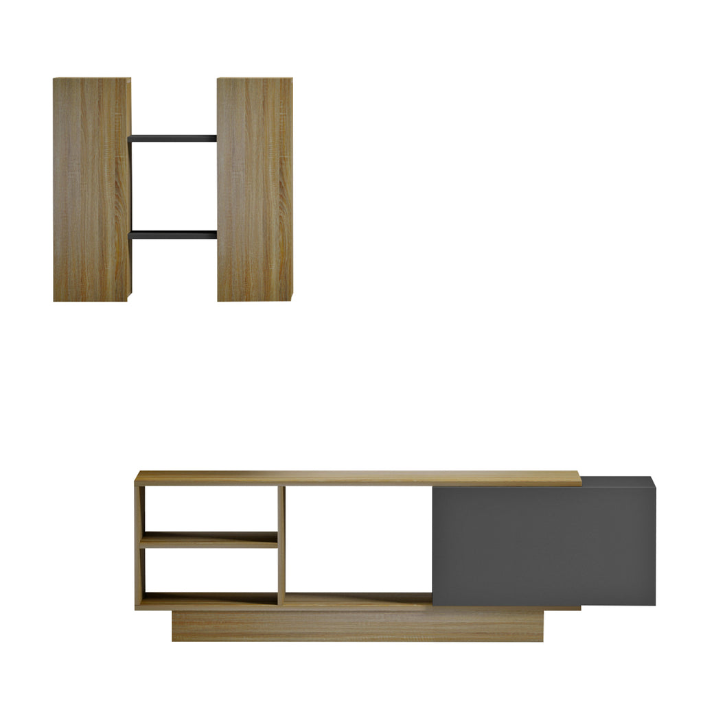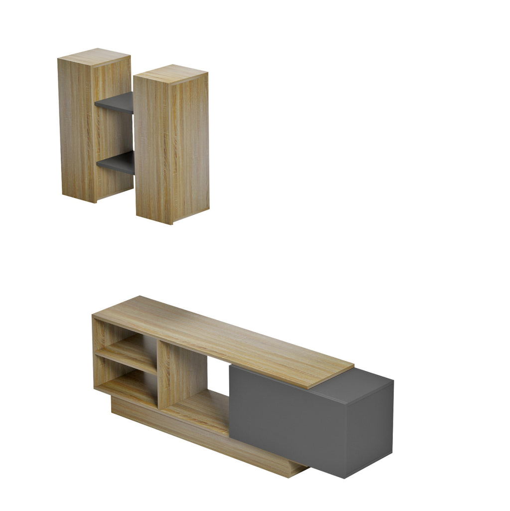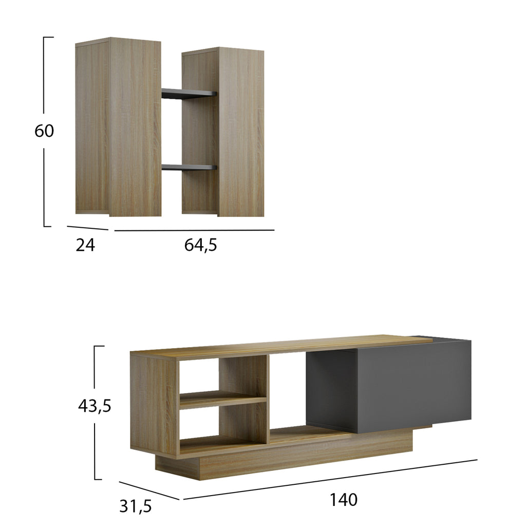 TYSON е модерен и практичен телевизор в цвят SONAMA и GREY, който ще разкраси всекидневната Ви! Основната мебел е дълга и разполага с 1 шкаф за съхранение на предмети и 3 отворени пространства за поставяне на електронни устройства, дребни предмети и книги. Композицията е завършена от 2 стенни шкафа с вътрешни рафтове, които са "съединени" с други два стенни отворени рафта. Това е семпло, елегантно и цялостно предложение за вашия хол! РАЗМЕРИ: Основен модул: 140x31.5x43.5H cm. Стенни шкафове: 64,5x24x60H см. Дебелина на меламина: 15 мм. (1,5 см) МАТЕРИАЛИ НА ИЗРАБОТКА: Цялата мебел е изработена от висококачествен меламин. Меламинът е вид дървесина под формата на ПДЧ. ПДЧ са продукти, които имат формата на плоча (панел). Като материал е много издръжлив и с голяма твърдост, в резултат на което е много устойчив на драскотини, протриване и петна. ПОДДРЪЖКА: Меламинът, който е строителният материал, се почиства много лесно от петна благодарение на твърдата си повърхност. Можете да забършете всички повърхности с влажна кърпа и това е достатъчно, за да изглеждат вашите мебели отново като нови. За упорити петна можете да използвате мек почистващ препарат. *Продуктът се доставя несглобен във фабрична опаковка ** Цветопредаването на продукта може леко да се различава от фотографското изображение на вашия екран.