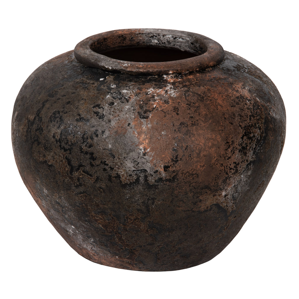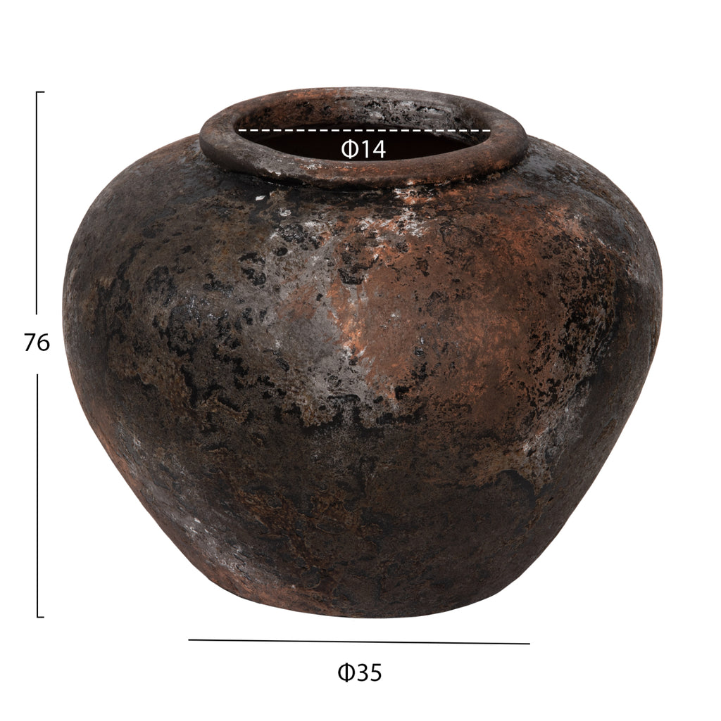 Декоративната ваза MH4195 е сравнително ниска и широка с голямо гърло. Той е в цвят СТАРИ ВЪГЛЕНИ и може да се комбинира навсякъде, където пожелаете. Или у дома, или в бизнес помещения. РАЗМЕРИ: Φ35x27H см. Устие: Φ14 см. СТРОИТЕЛНИ МАТЕРИАЛИ: Строителният материал е теракот. Теракотата е керамичен материал. Името му идва от латински и означава "видима почва" (terra = почва, пръст и cotta = видима, изпечена). Затова, когато казваме, че нещо е направено от теракот, имаме предвид, че е направено от глина. ПОДДРЪЖКА: Едно почистване с прах обикновено е достатъчно. Ако искате, можете да го измиете с вода, но избягвайте използването на химически почистващи препарати.