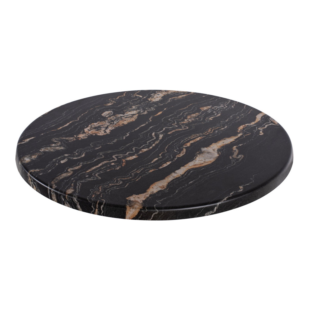 Професионален кръгъл плот в цвят мрамор BLACK-GOLD, който е подходящ за контакт с храни и като цяло материалът е екологичен. Може да се използва в кафенета, ресторанти и туристически места за настаняване, на закрито или на открито. РАЗМЕРИ: Φ60см. Дебелина на повърхността 20.5mm КОНСТРУКТИВЕН МАТЕРИАЛ: Повърхността е изработена от WERZALIT. Versalite е лек, здрав, плътен и синтетичен материал, който е устойчив на драскотини, температурни колебания и петна, като същевременно работата му е стабилна (т.е. има огромна здравина) дори при най-суровите вътрешни и външни условия. Повърхността може да издържи на топлина до 180 градуса по Целзий (356F) без изгаряне и няма да има следи от изгаряне от цигари или други горещи предмети. Този материал е резултат от патентован процес, който използва специализирани машини, които създават огромно налягане за формоване на дървесни зърна и смола в използваеми форми. -- Възможно е да показват леки извивки в "тялото" си след продължително излагане на слънце и високи температури. Въпреки това, те се връщат в първоначалното си състояние, когато се съхраняват при ниска температура. ПОДДРЪЖКА: Повърхността Versalite е лесна за почистване и поддръжка, което я прави хигиенична повърхност. Не изисква специални почистващи препарати. Важна забележка: Пакетът НЕ включва винтове за фиксиране на повърхността. Преди да поставите винтовете, трябва да проверите размера им, за да избегнете износване на повърхността. ВНИМАНИЕ* Подпорната основа на масата в идеалния случай трябва да покрива 70% от повърхността.