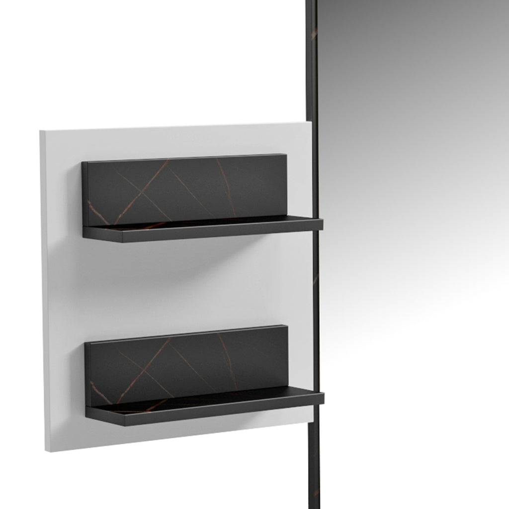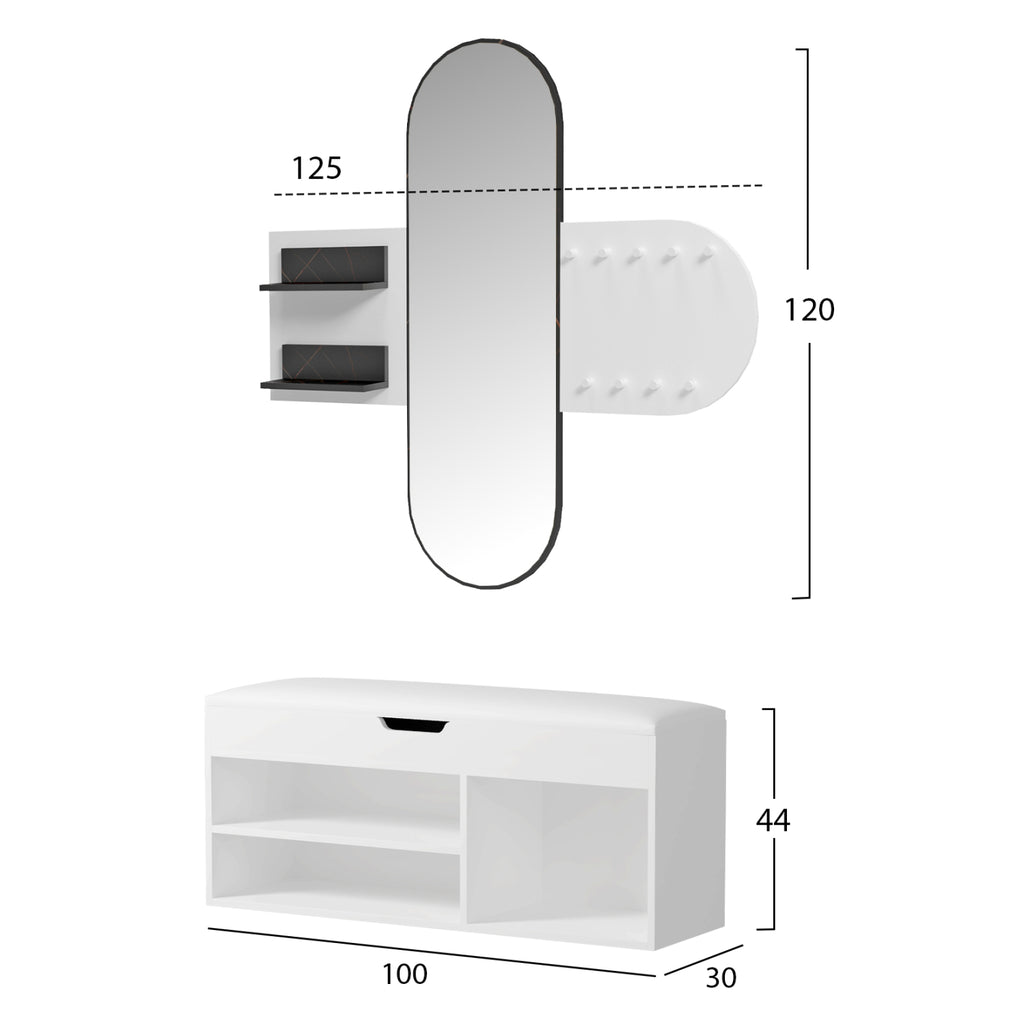 Входният комплект се състои от закачалка с овално огледало и поставка за обувки със седалка. Закачалката разполага с девет куки, подредени от едната страна на огледалото – удобни за палта, якета и чанти. От другата страна има два рафта в изискан цвят черен мрамор, които придават модерен акцент и осигуряват място за декоративни елементи.